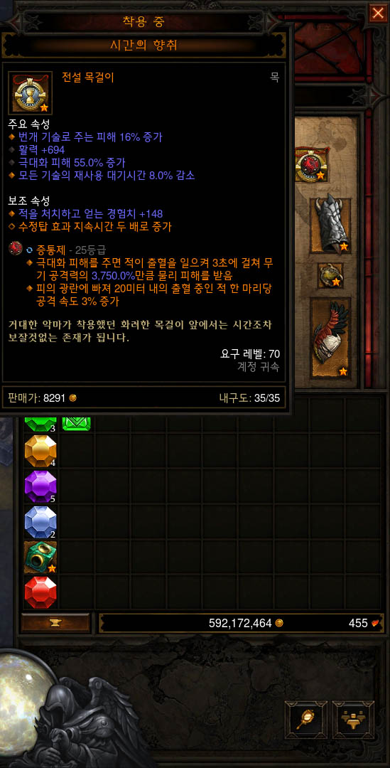 목걸이는 시간의 향취를 보통 넣는데 고단 대균열이 아니라면 굳이 넣을 필요가 없을것 같습니다. 신단효과 지속때문에 쓰거든요.