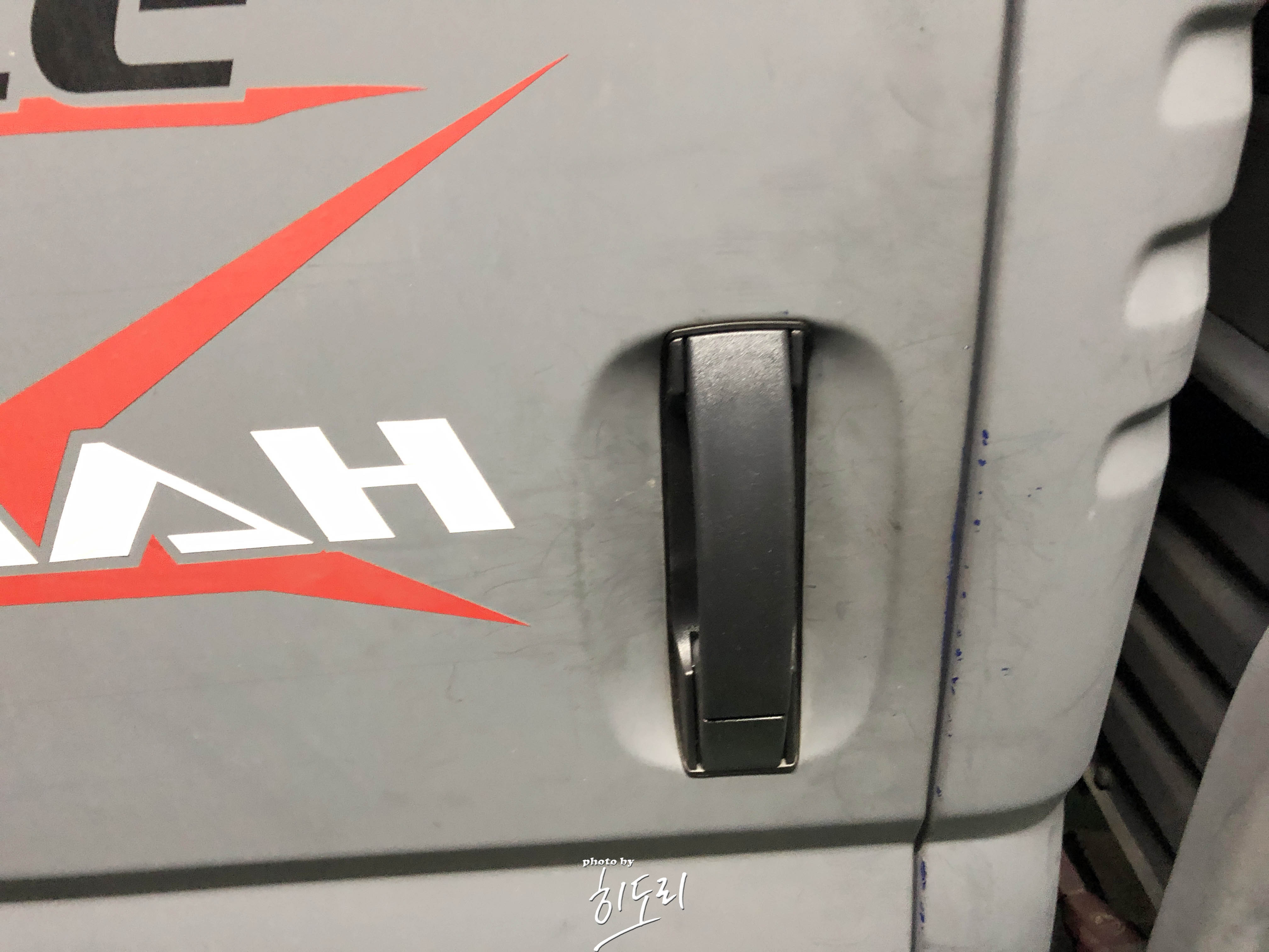 플라스틱딥으로 올도색된 봉고3라 외캐치도 무광 회색이었는데 새로 바뀐 외캐치만 검은색이네요.