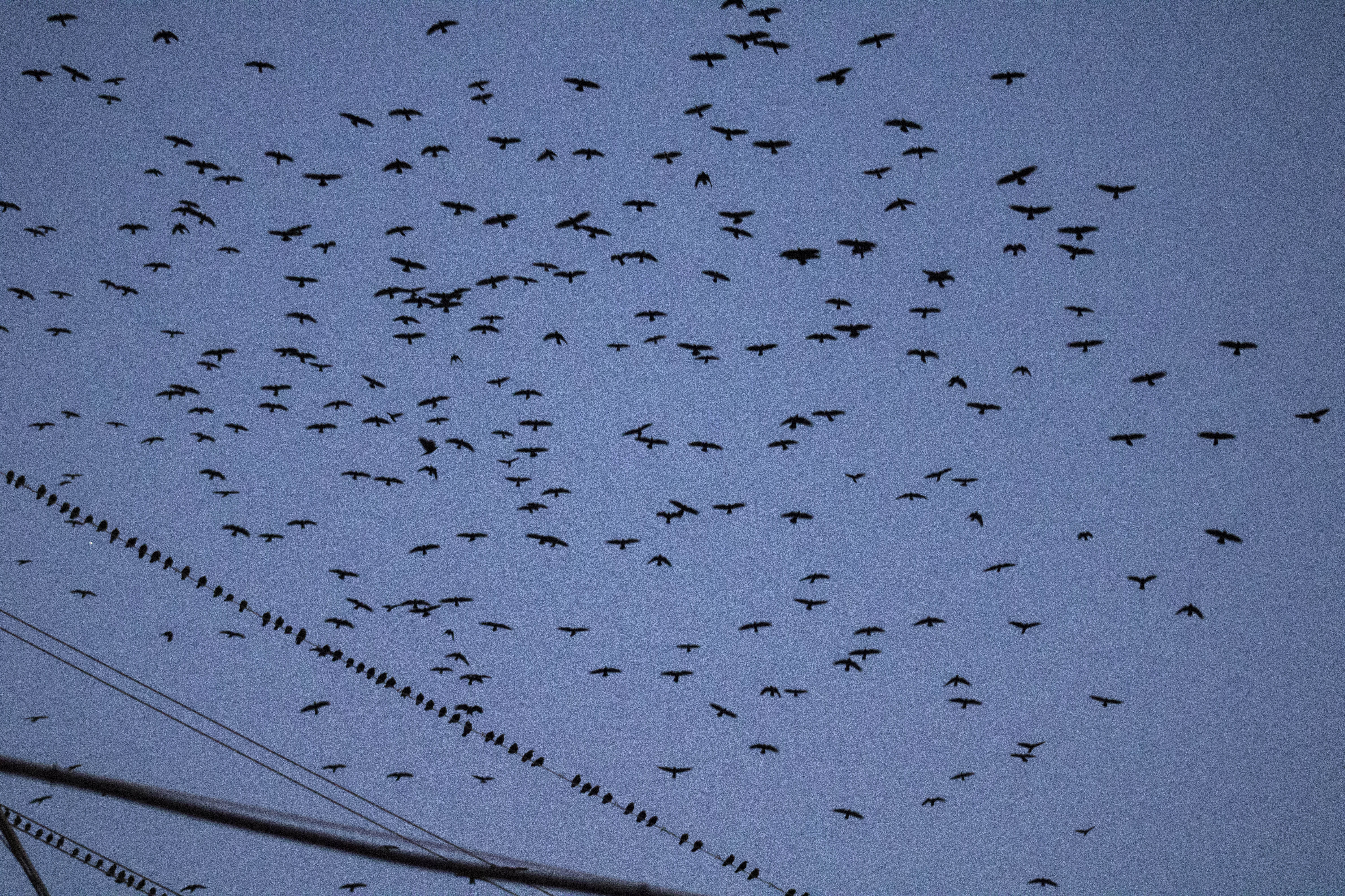 떼까마귀가 이렇게 많이 있으면 까마귀 똥이 빨래에 문제라고 생각하실 수가 있는데 사실 떼까마귀는 해뜨기 50분 전에 날아가고 해가 떨어져서야 돌아옵니다.