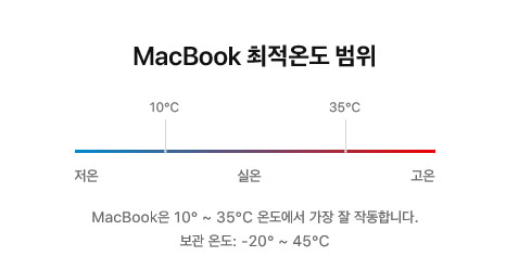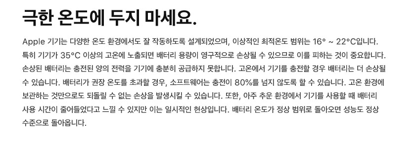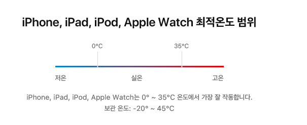 아이폰, 아이패드, 아이팟, 애플 워치, 맥북 등 애플 기기들의 최적 온도 범위는 윗 이미지를 참조하세요.