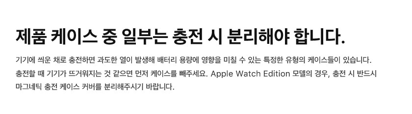 아이폰인 경우 기기를 충전할 때 케이스를 분리하고 충전하는 것이 좋습니다. 케이스를 끼우고 충전하면 기기가 과열이 되죠. 케이스를 부착하고 충전 시 기기가 뜨거워진다면 케이스를 꼭 분리하고 충전해주세요.
