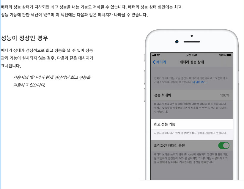 '사용자의 배터리가 현재 정상적인 최고 성능을 지원하고 있습니다'