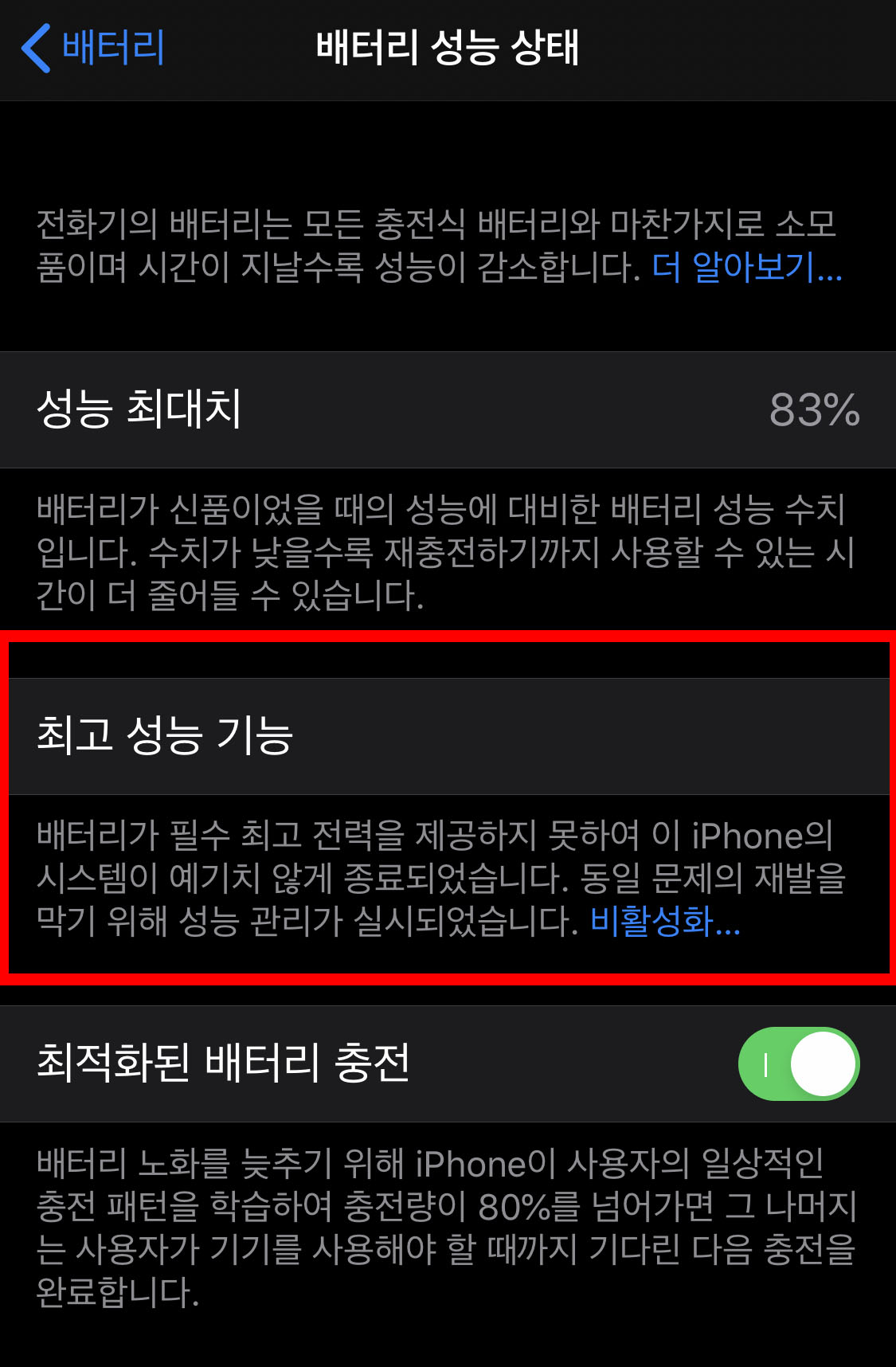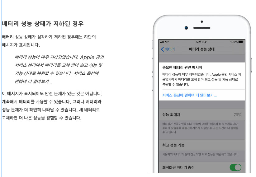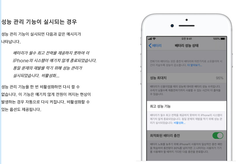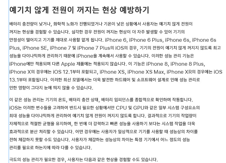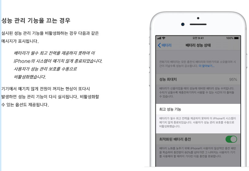 '배터리가 필수 최고 전력을 제공하지 못하여 이 아이폰의 시스템이 예기치 않게 종료되었습니다. 동일 문제의 재발을 막기 위해 성능 관리가 실시되었습니다'