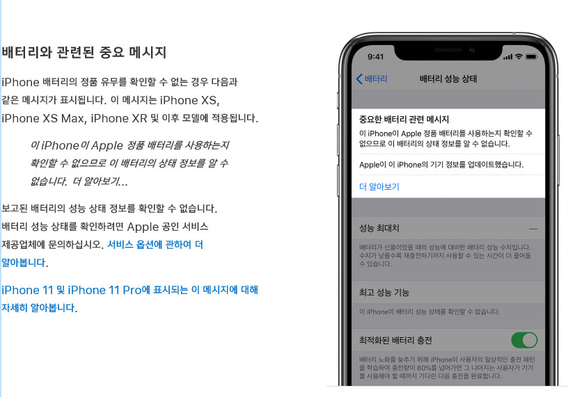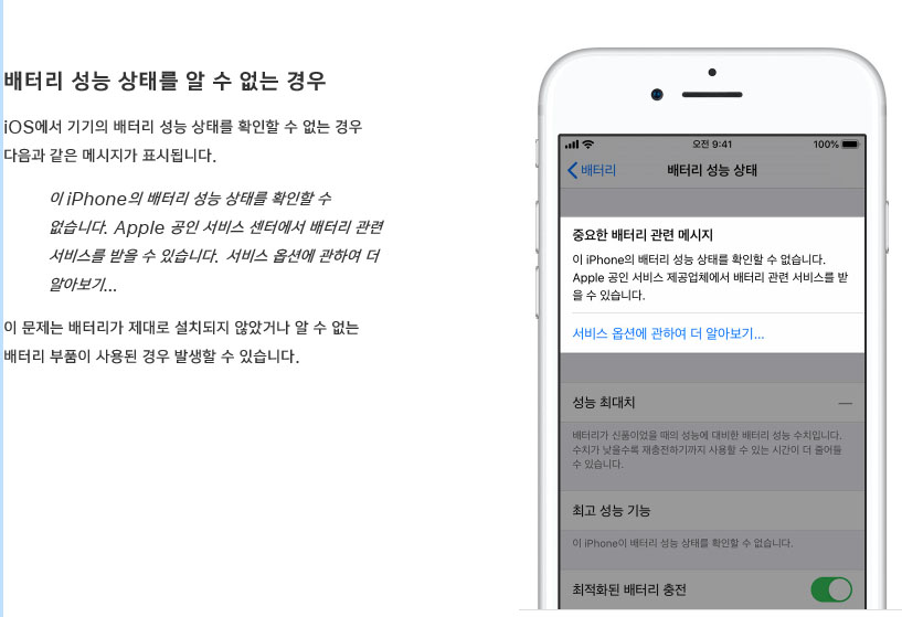 아 그리고 혹시 사설업체에서 배터리를 교환했을 경우 정품 배터리가 아니라면 성능 최대치가 표기가 안되니 이걸로 정품인지 비정품인지를 알수가 있겠죠?