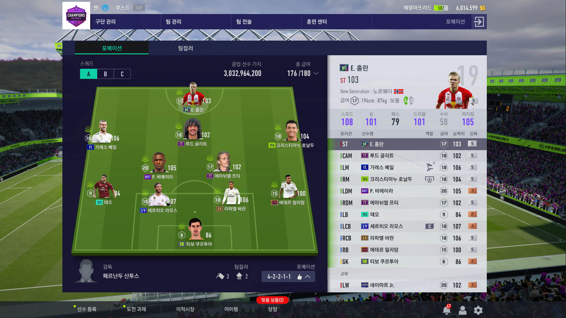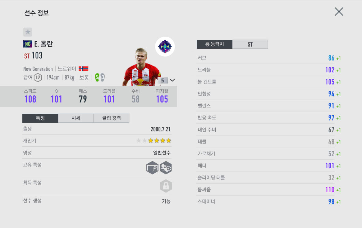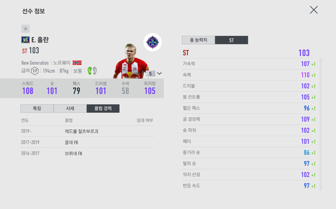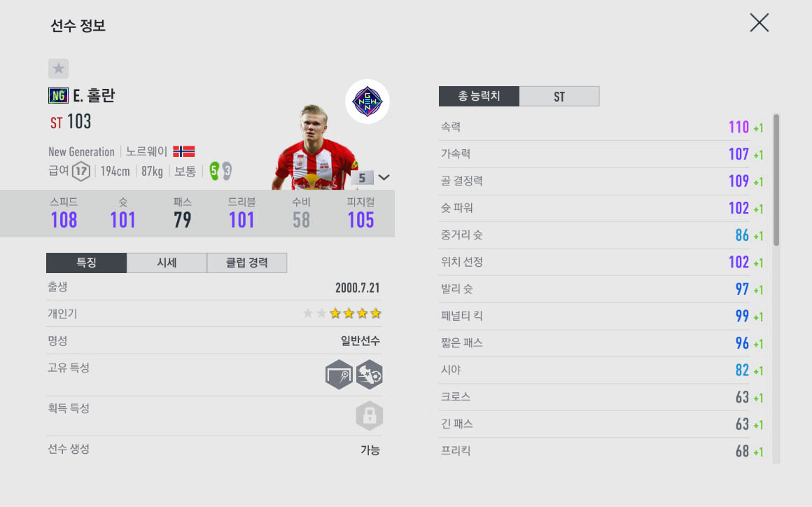 일반시즌은 스텟이 66으로 볼품이 없지만 NG시즌의 홀란은 92능력치로 꽤 가성비가 좋은 선수중 하나입니다.