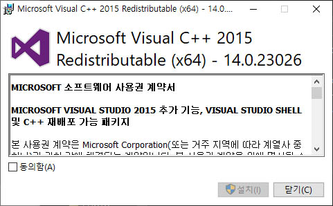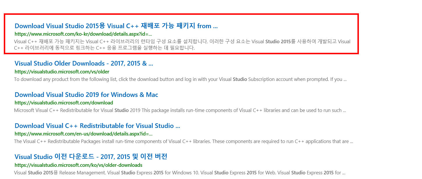 그럼 제일 윗쪽에 visual studio 2015 재배포 가능 패키지라고 나옵니다.