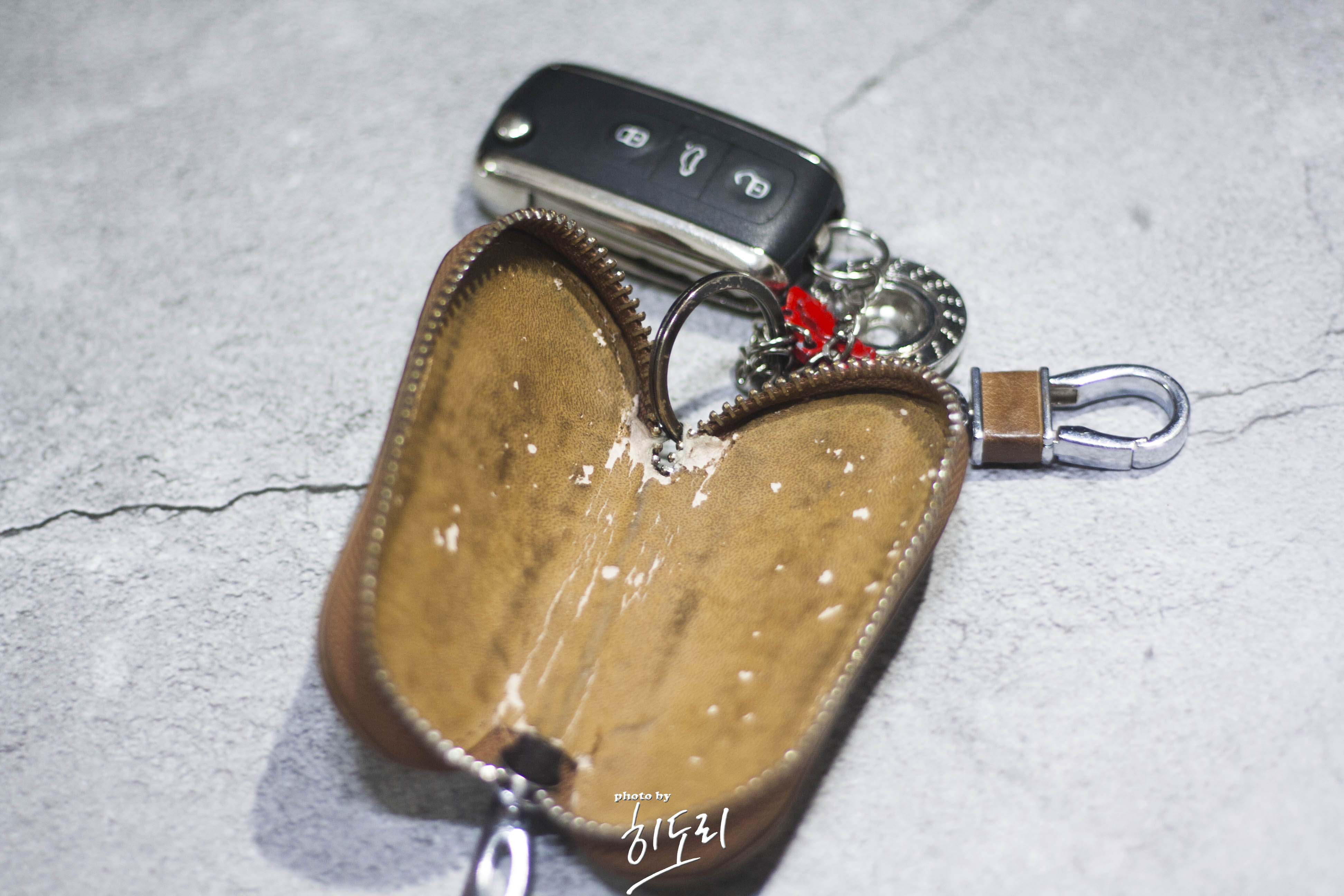 윗 사진의 키홀더는 4년정도 사용했던 키홀더 인데.... 분명히 구입했을때 소가죽이라 튼튼하다고 했었는데... 키링 부분이 뜯어졌어요.