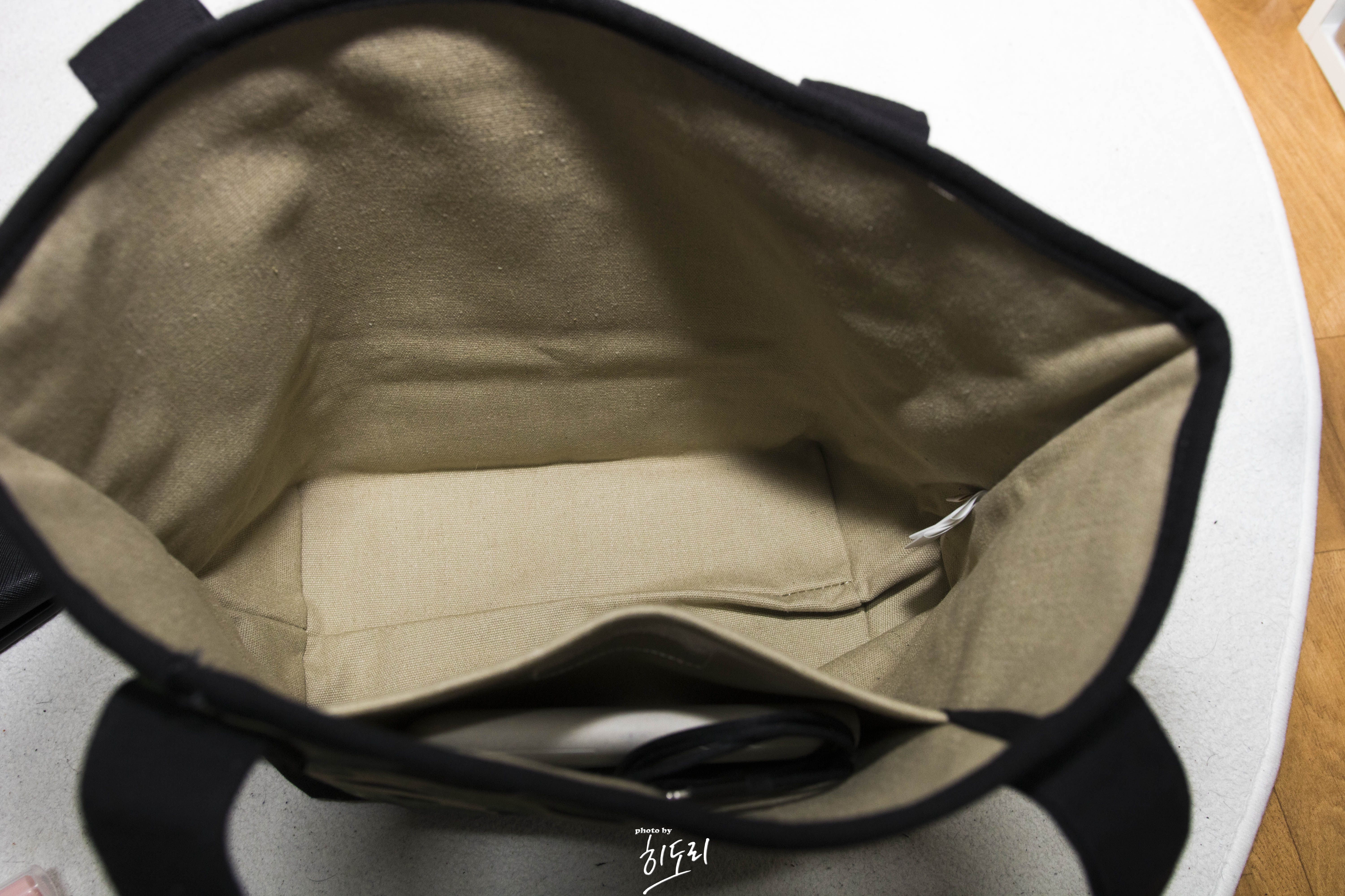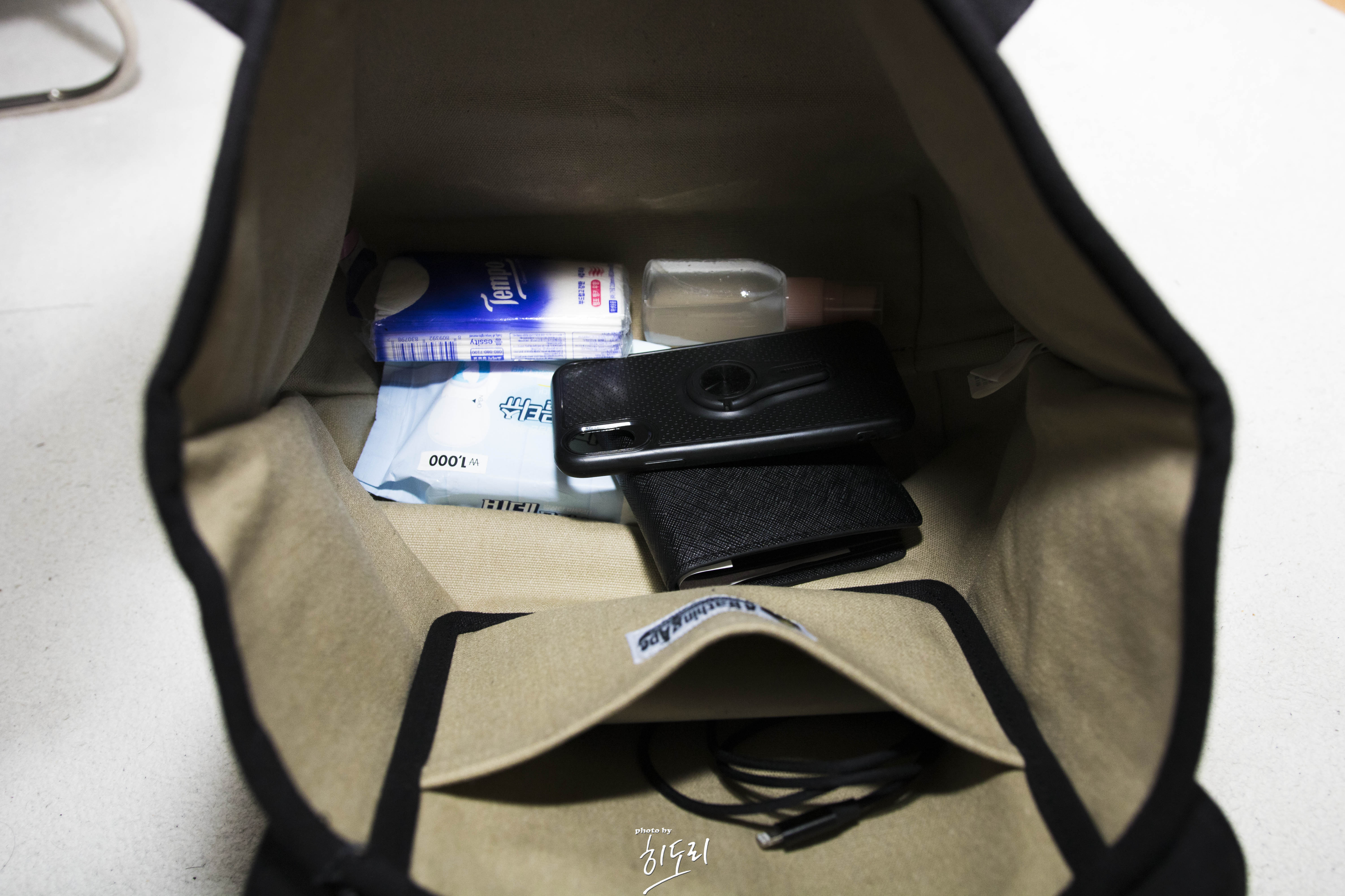 그런데 토트백 지퍼가 따로 없기에 가방을 거꾸로 놓게 되면 내부 물건들은 쑥쑥 잘 빠질꺼 같아요.