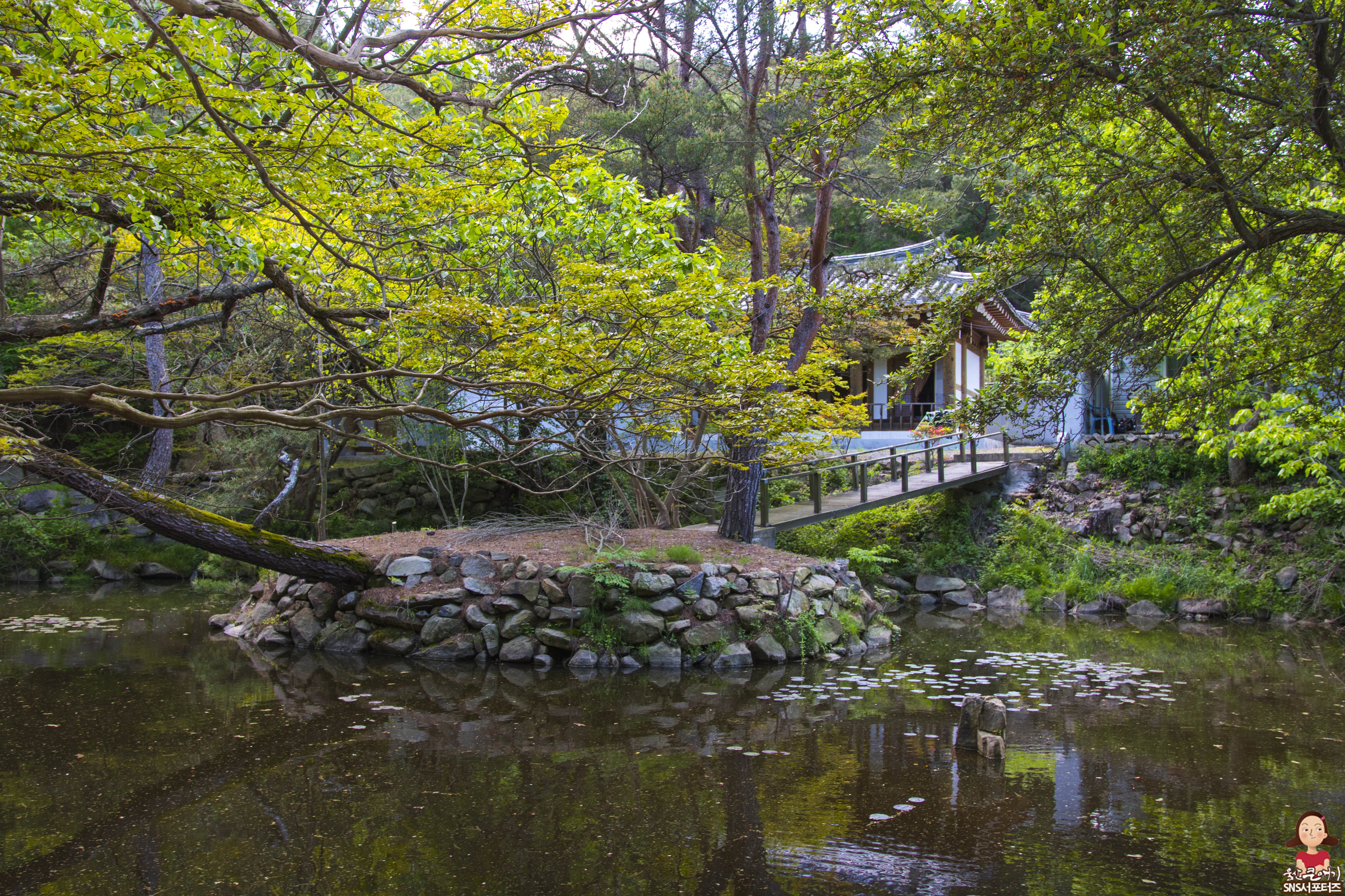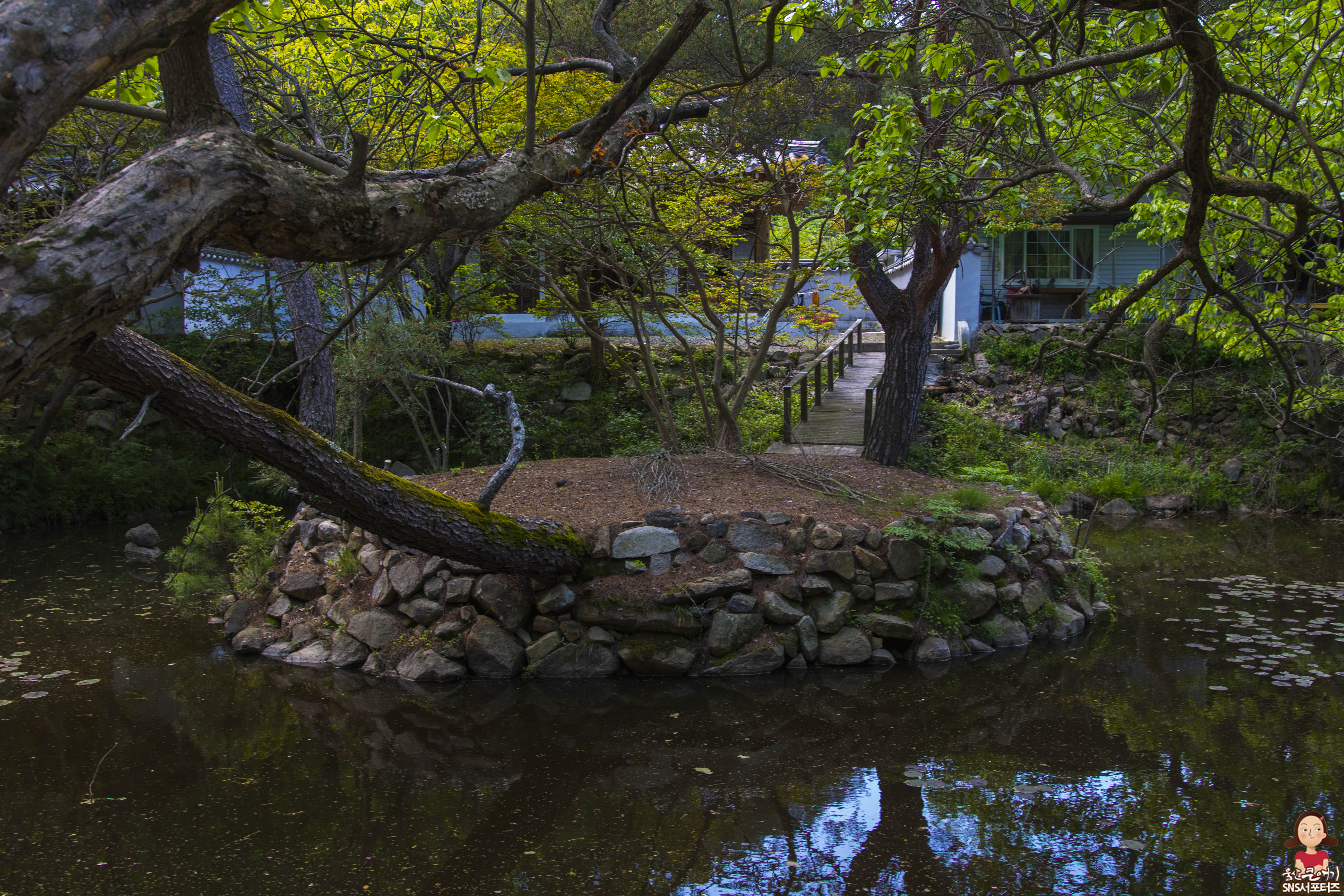 제실 앞에 사각형의 연못이 있고 연못 주변은 수 백년은 됐음 직한 목백일홍과 느티나무, 노송 등으로 둘러싸여 있어 장관입니다. 연못 한가운데는 연못가와 연결된 조그만 섬이 있는데 직접 보시면 정말 멋진 풍경을 볼수가 있습니다.