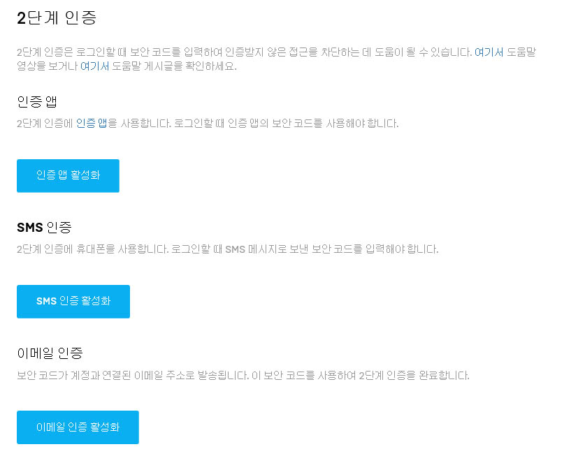 2단계 인증은 인증앱,SMS인증,이메일인증중 한가지만 선택하셔서 인증 활성화를 하시면 됩니다.