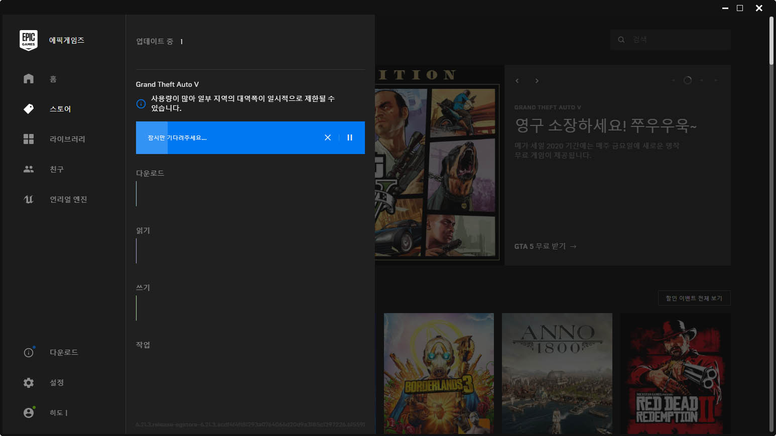 그냥 지금은 에픽게임즈 서버가 폭주중이다 보니 나중에 다시 설치를 해봐야겠습니다. 일단 구입만 해놓으면 평생 소장이 가능한 GTA5니 말이죠.