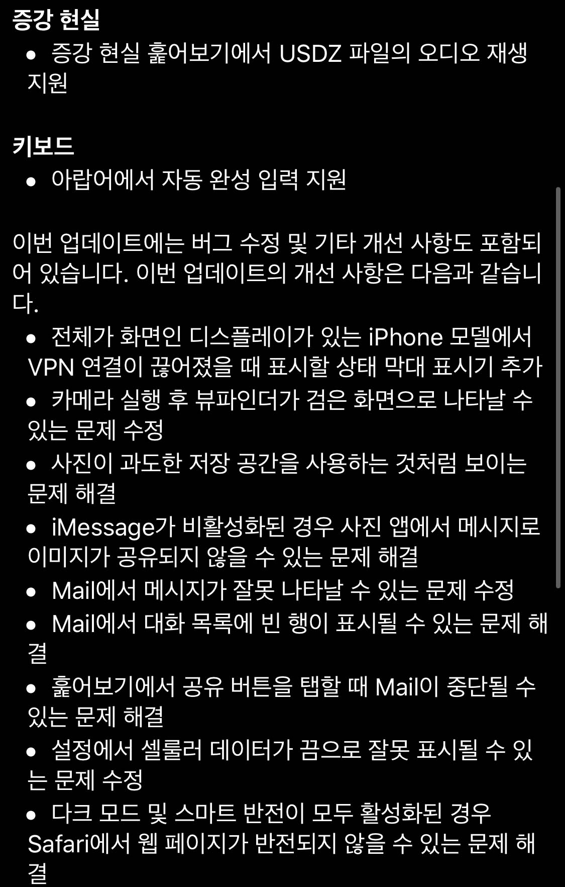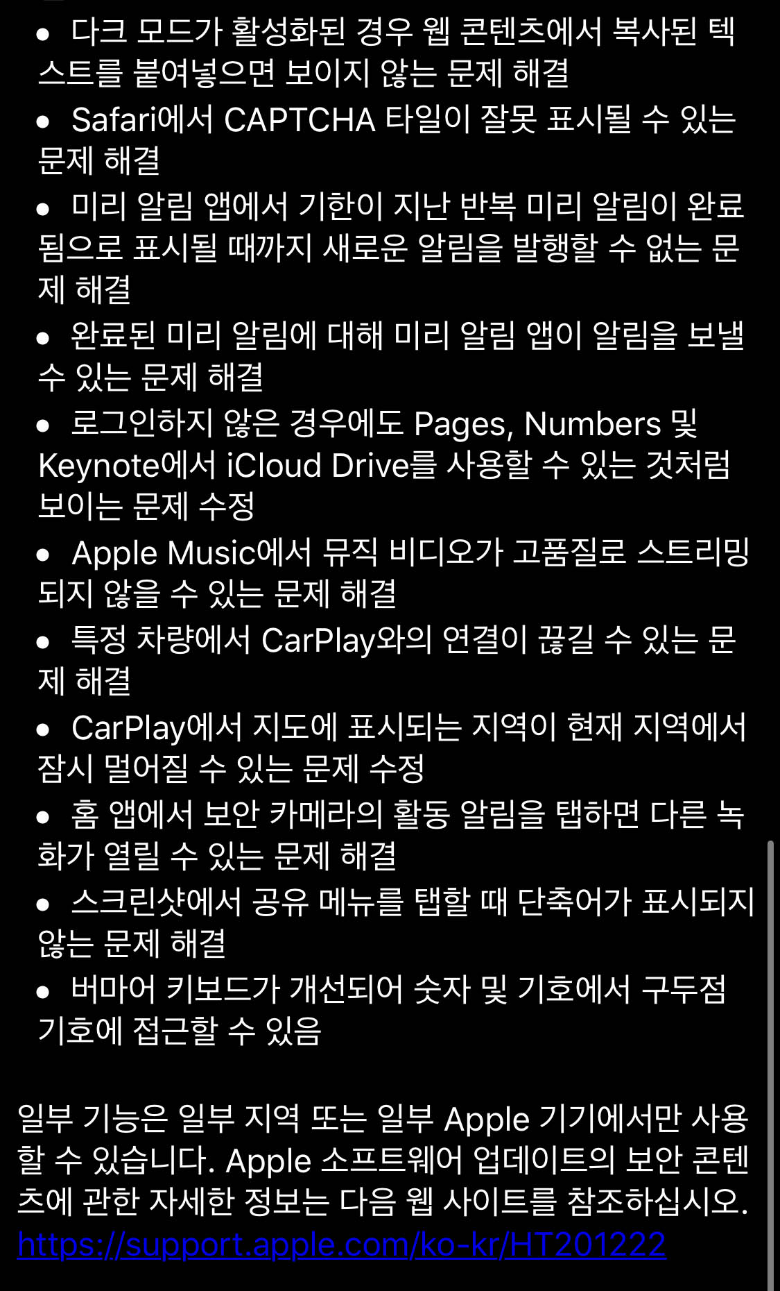 눈에 보이게 바뀐점은 없지만 각종 보안업데이트 있으니 iOS 업데이트는 꼭 해줘야되겟죠?