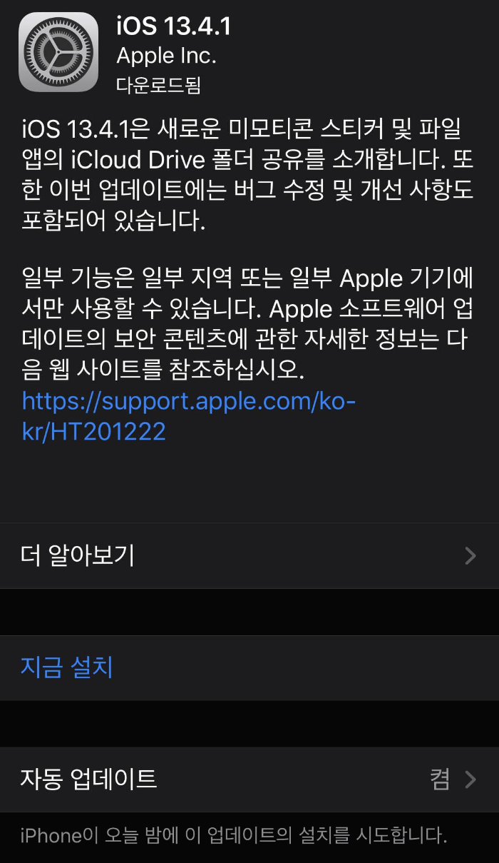 'iOS 13.4.1은 새로운 미모티콘 스티커 및 파일앱의 아이클라우드 드라이브 폴더 공유를 소개합니다. 또한 이번 업데이트에는 버그 수정 및 개선 사항도 포함되어 있습니다.'