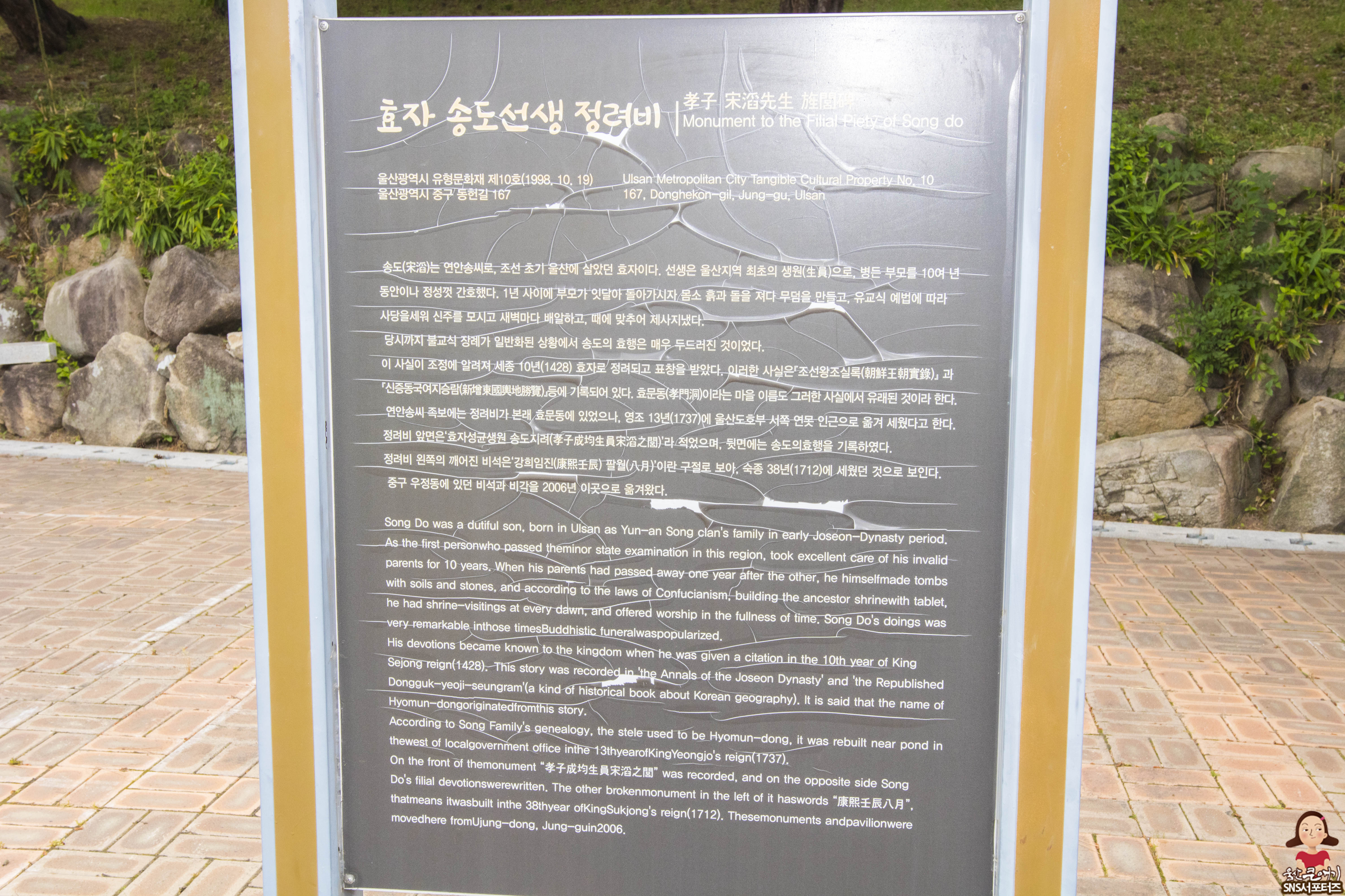 북구의 효문동(孝門洞)이라는 마을 이름도 이러한 사실에서 유래되어 만들어졌다고 합니다. 연안송씨 족보에는 정려비가 본래 효문동에 있었으나, 영조 13년(1737)에 울산도호부 서쪽 연못 인근으로 옮겨 세워졌죠. 그리고 중구 우정동에 있던 비석과 비각을 2006년 이곳으로 옮겨졌다고 합니다.