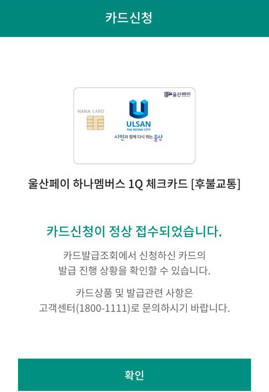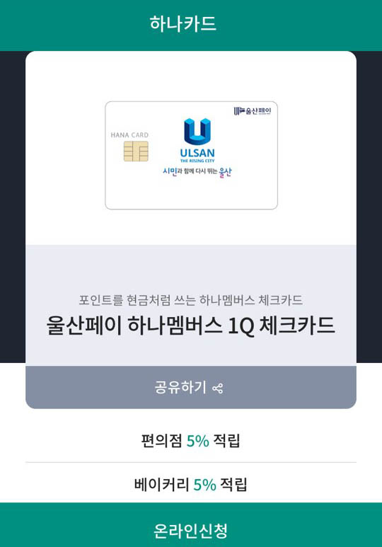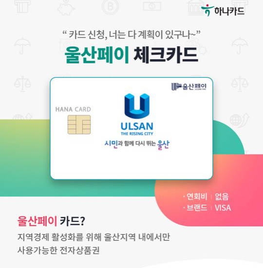 울산페이는 하나은행과 제휴가 되어 있는지 하나카드에서 체크카드 방식으로 발급이 됩니다.
