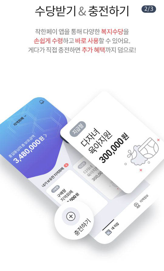 착한페이 앱을 통해 다양한 복지수당을 손쉽게 수령하고 바로 사용할수가 있습니다. 게다가 직접 충전하면 추가 헤택까지 덤으로 받을수가 있습니다.