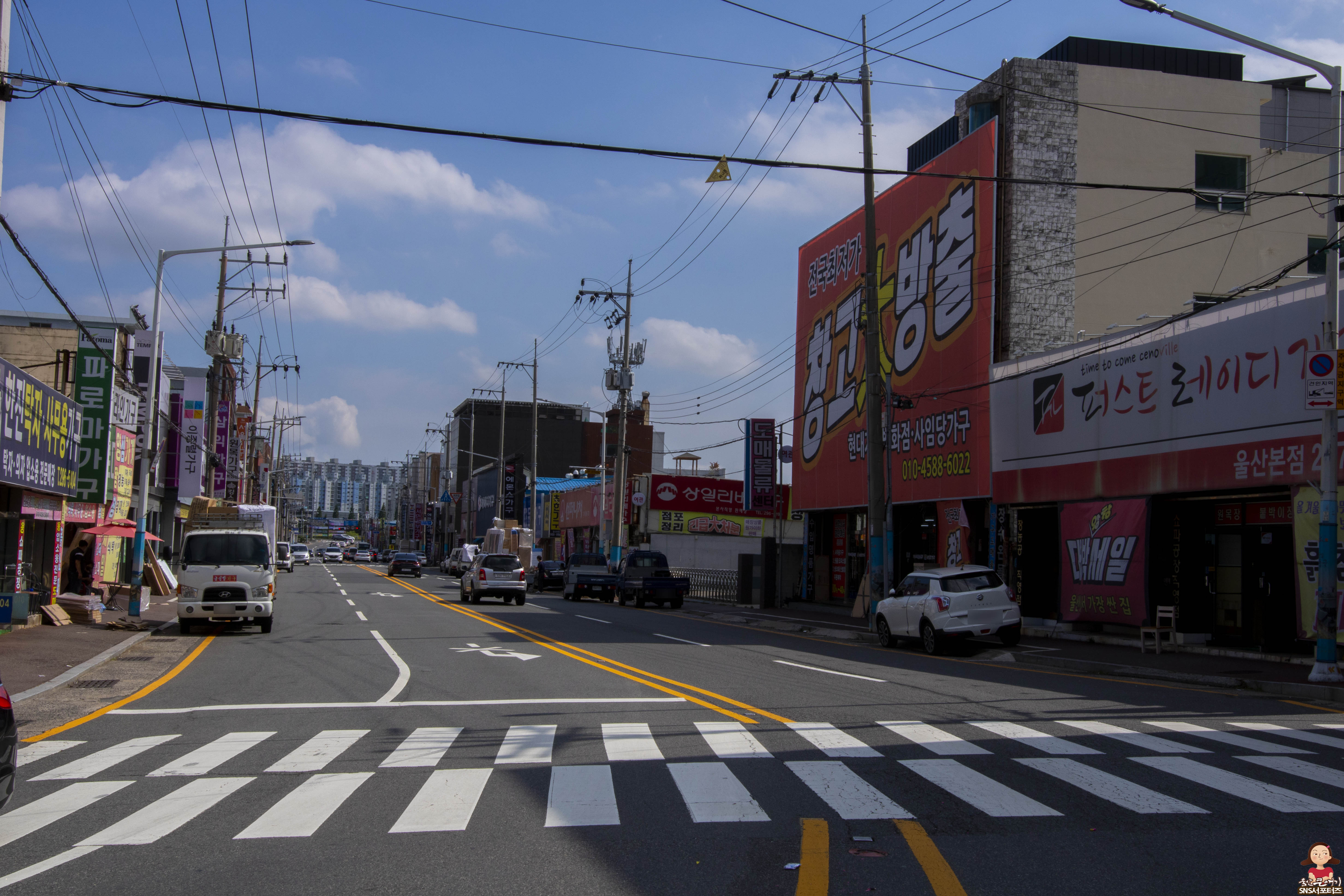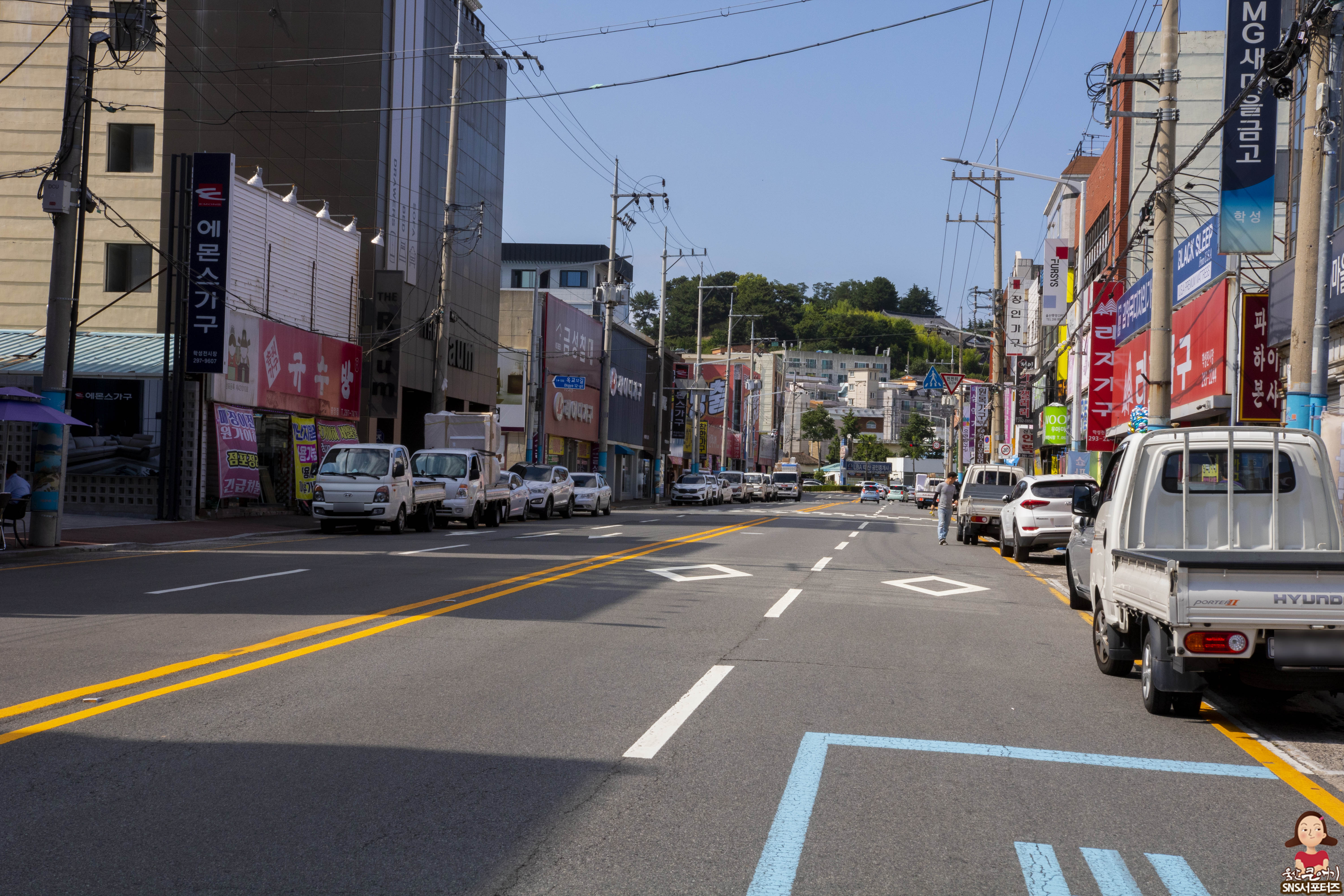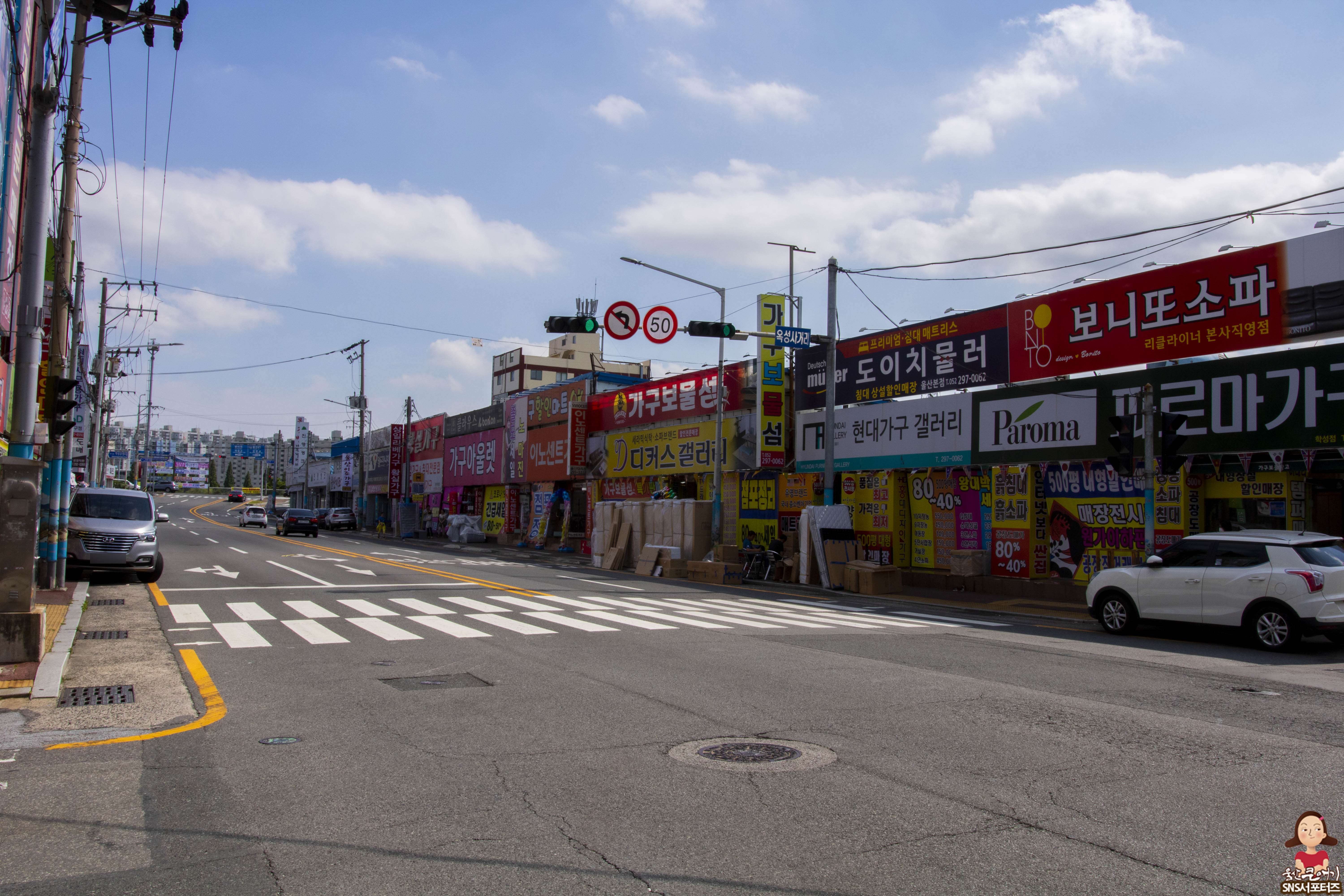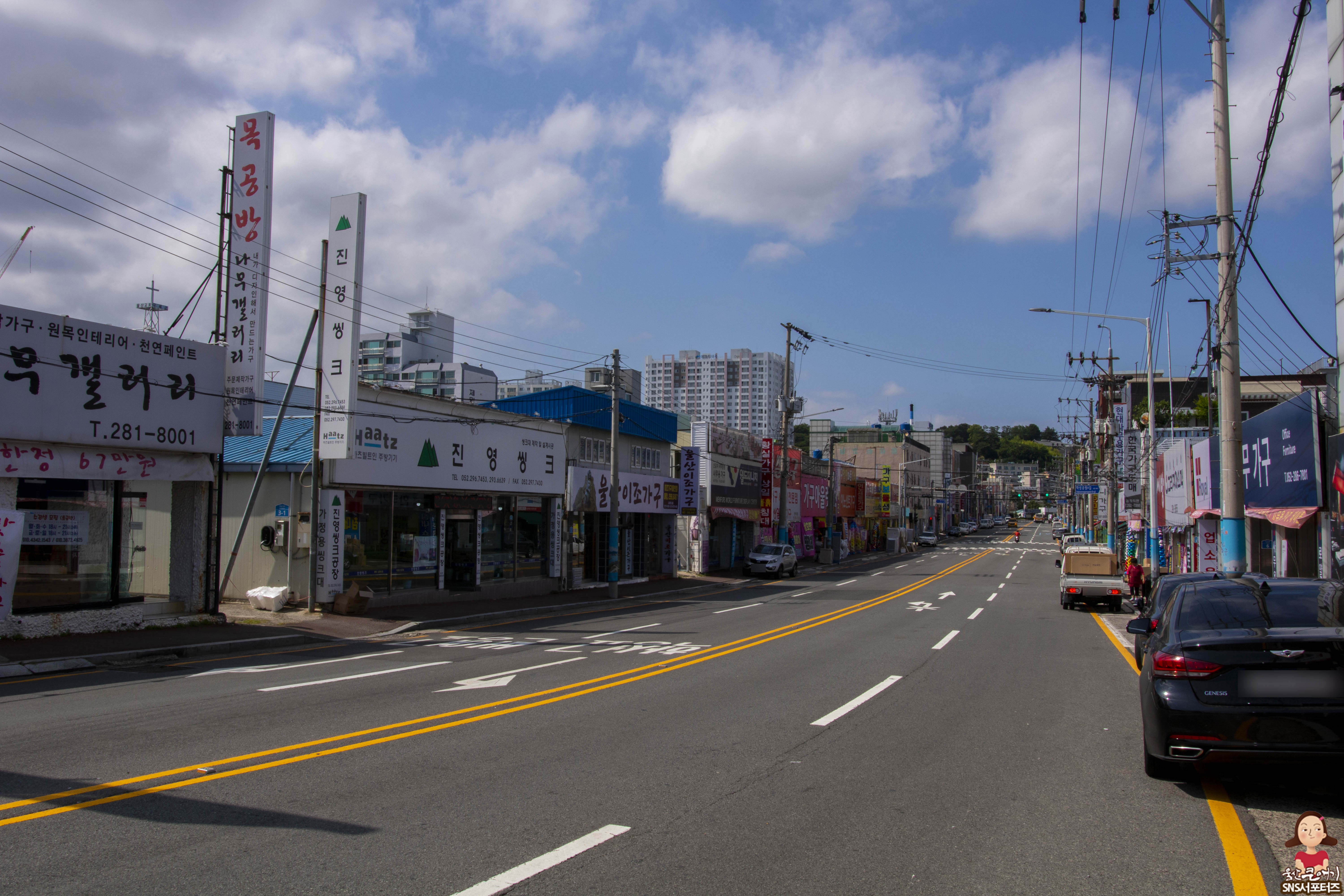 울산시 중구 학성가구전문거리 일대 도로를 사이에 두고 양쪽에 중소가구매장이 즐비하게 자리잡고 있는 모습입니다.