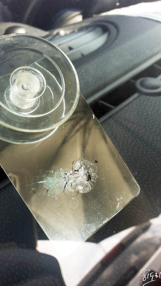자 다시 본글로 돌아와 돌빵 맞아 온 손님이시라는데 불가사리 모양으로 이뿌게 자동차 유리창이 깨졌습니다.