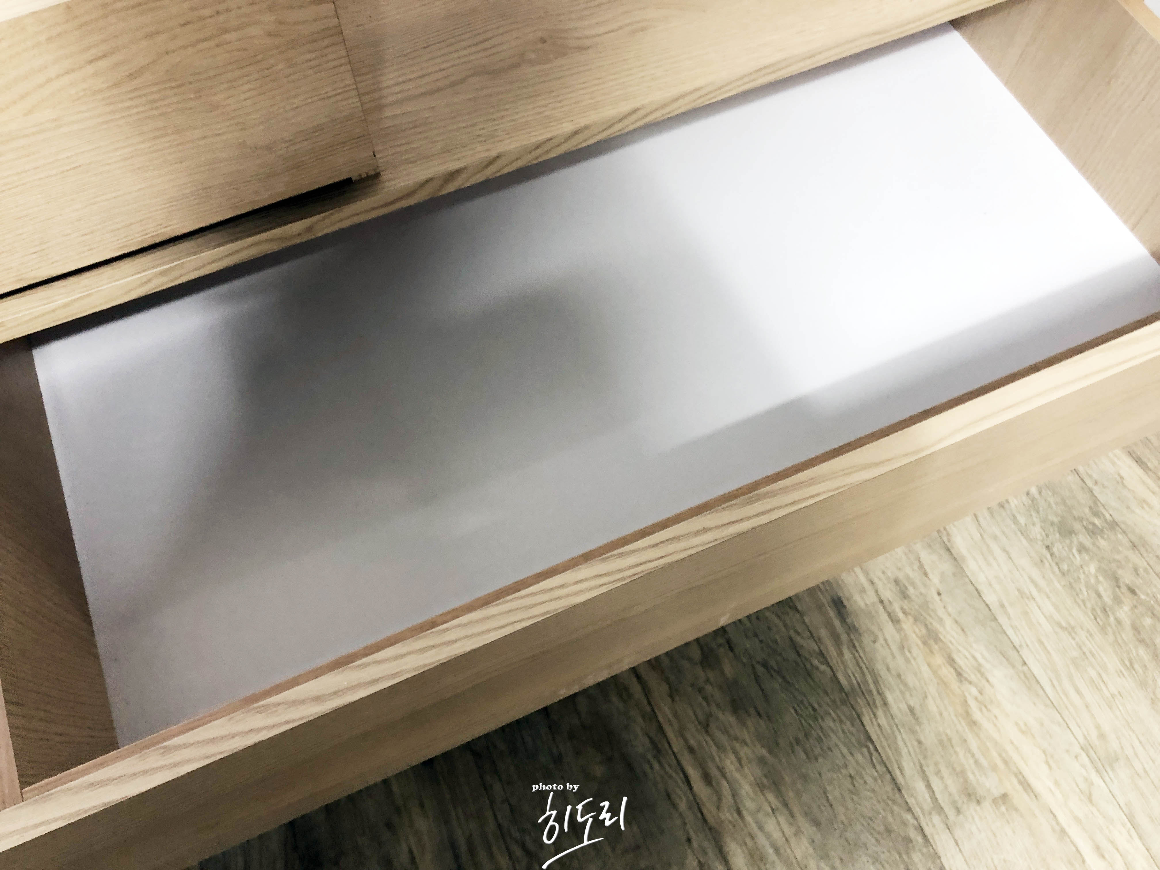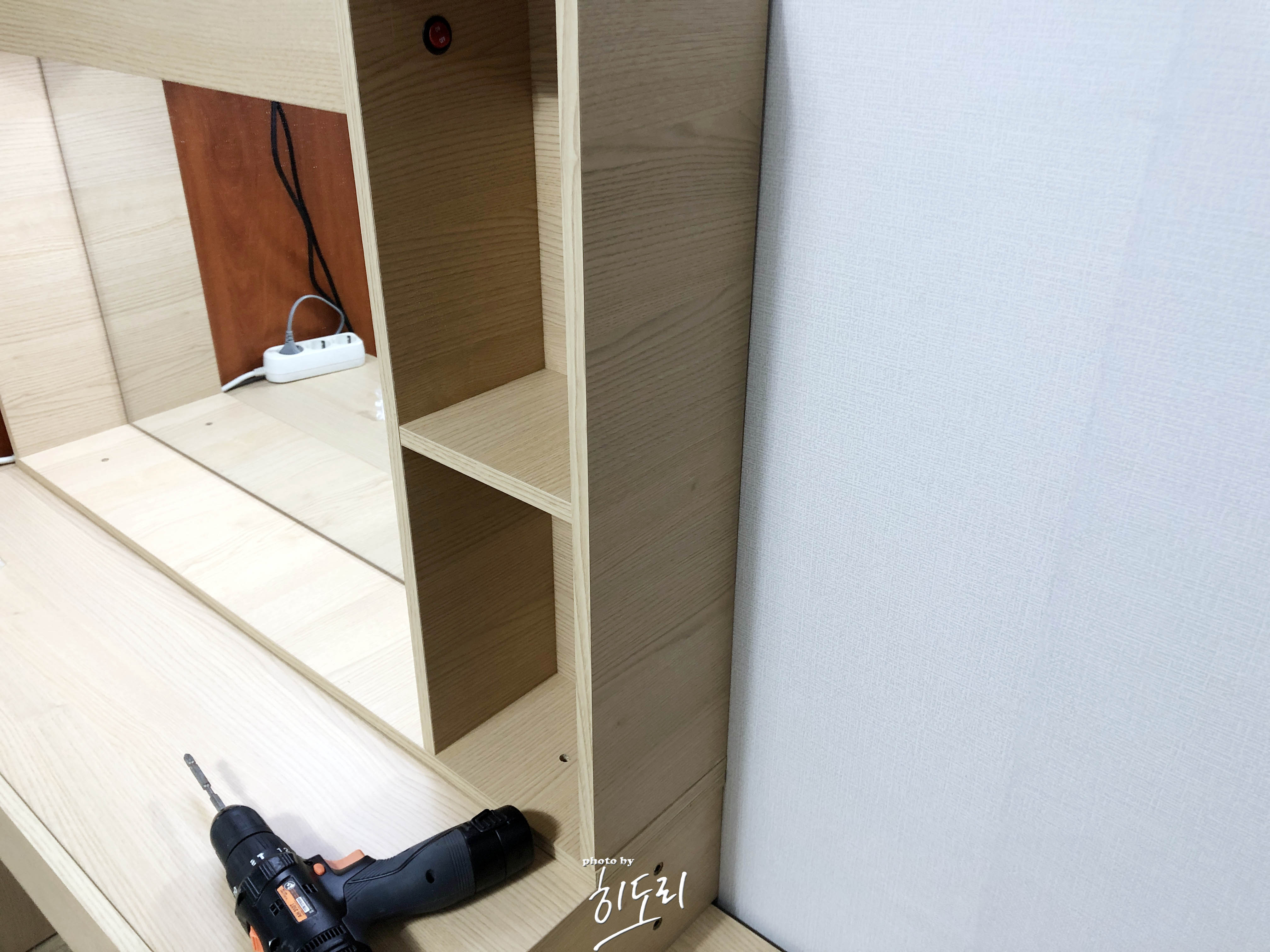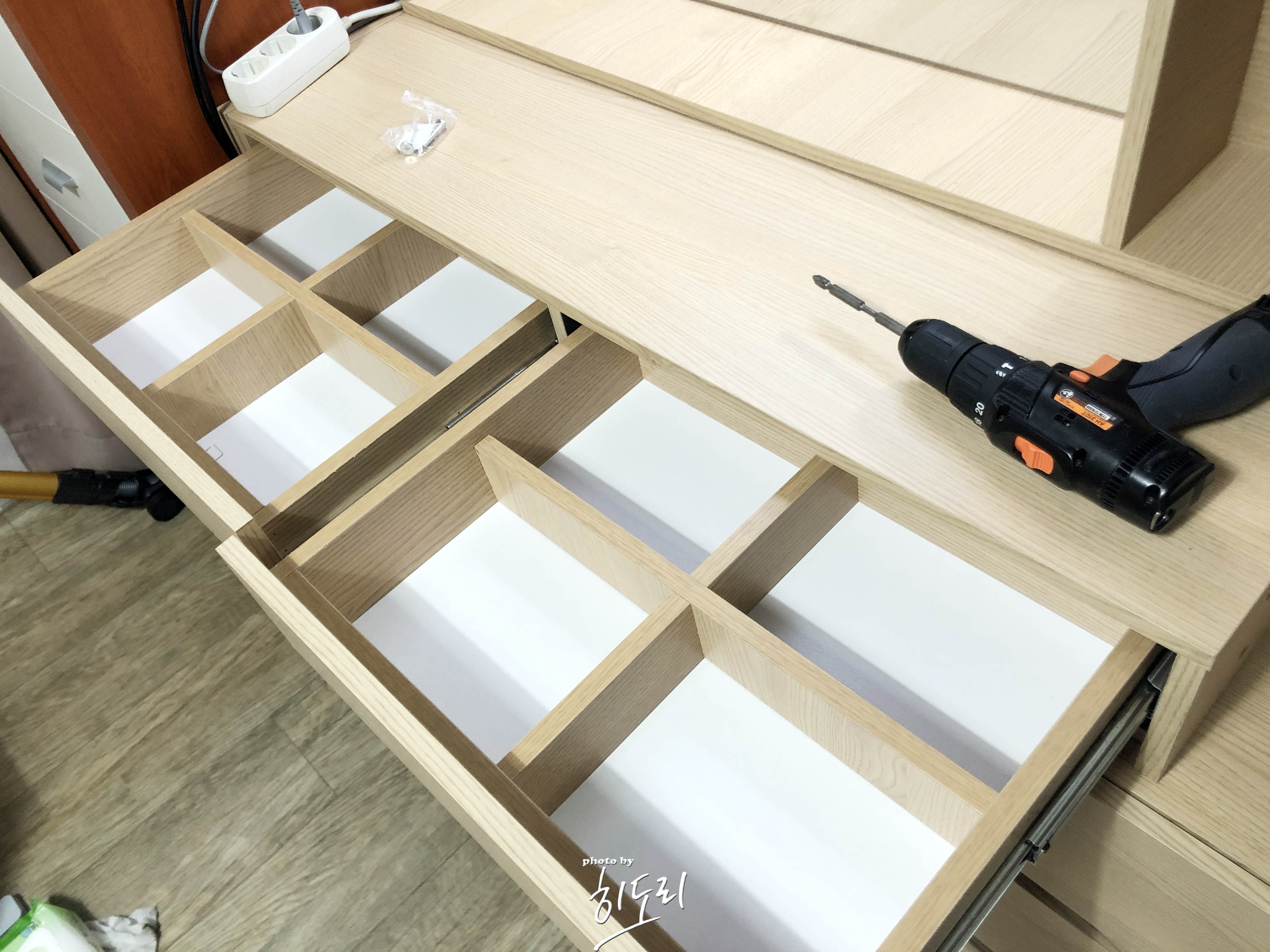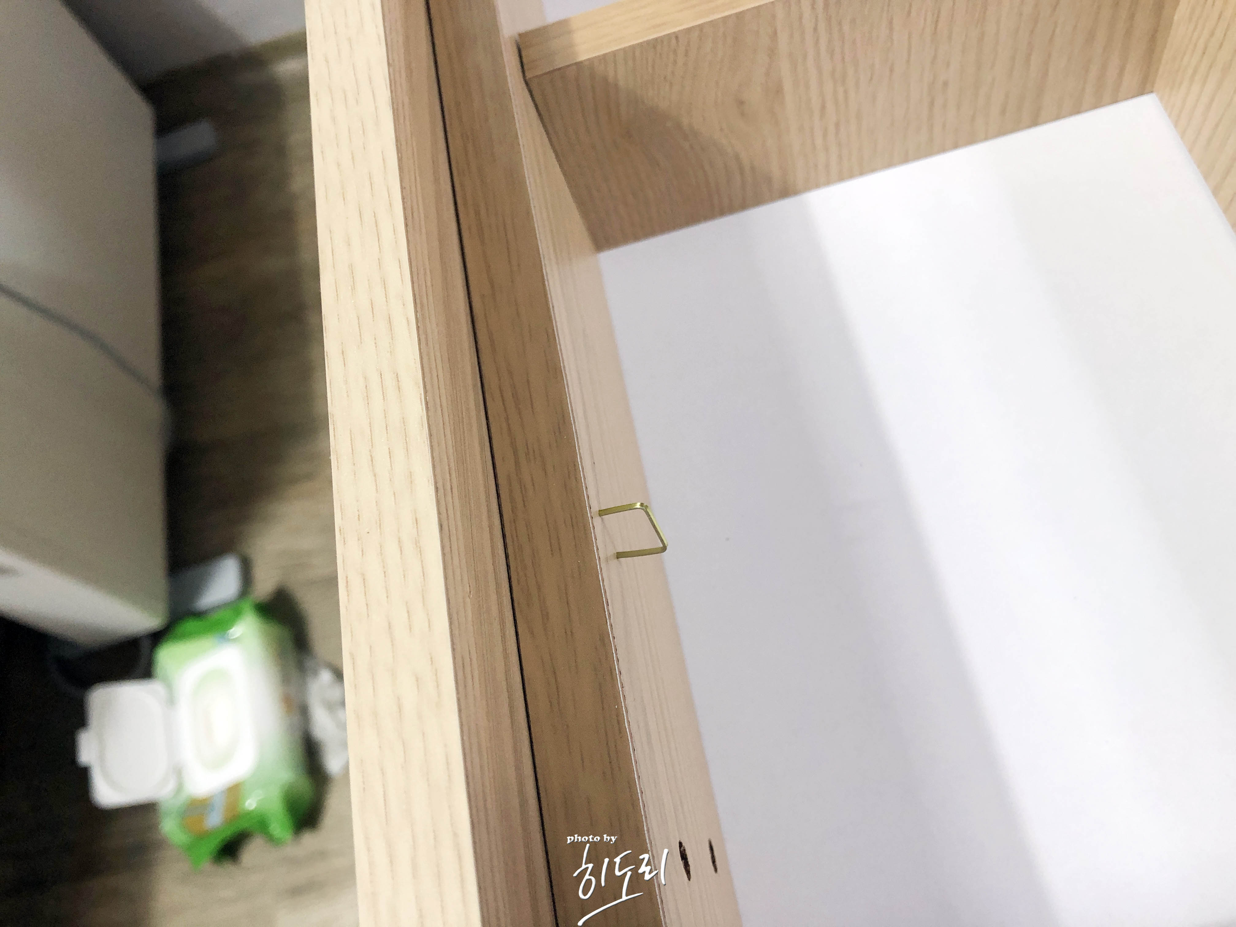 아! 조립을 하고 난 뒤 수납공간 안쪽에 보니 작은 철심히 박혀 있는것 보고 교환신청을 해야되나? 생각했는데 가만히 생각보니 화장대를 고정 시키기기 위한 나사봉지가 걸려 있던 철심... 그냥 살짝 힘주니 톡하고 떨어졌어요.