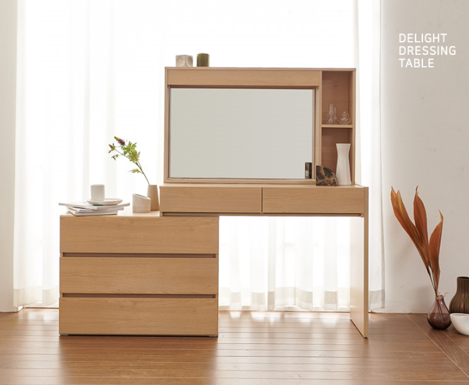 또한 서랍장 위치를 화장대밑으로 늘렸다 줄였다 하며 다리 역활로 사용할수 있어 공간활용도 더욱 만족스럽습니다.