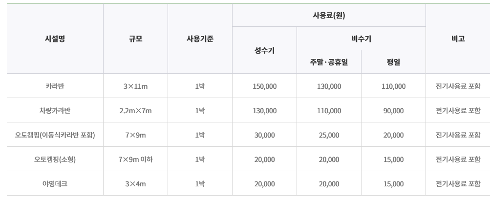 평일은 오토캠핑 1면당 2만원과 캠핑트레일는 11만원입니다. 매년 7~8월 성수기의 경우 오토캠핑은 하루 1면당 3만원, 캠핑트레일러는 하루 1대에 15만원으로 전기사용료는 포함이 된 금액입니다.
