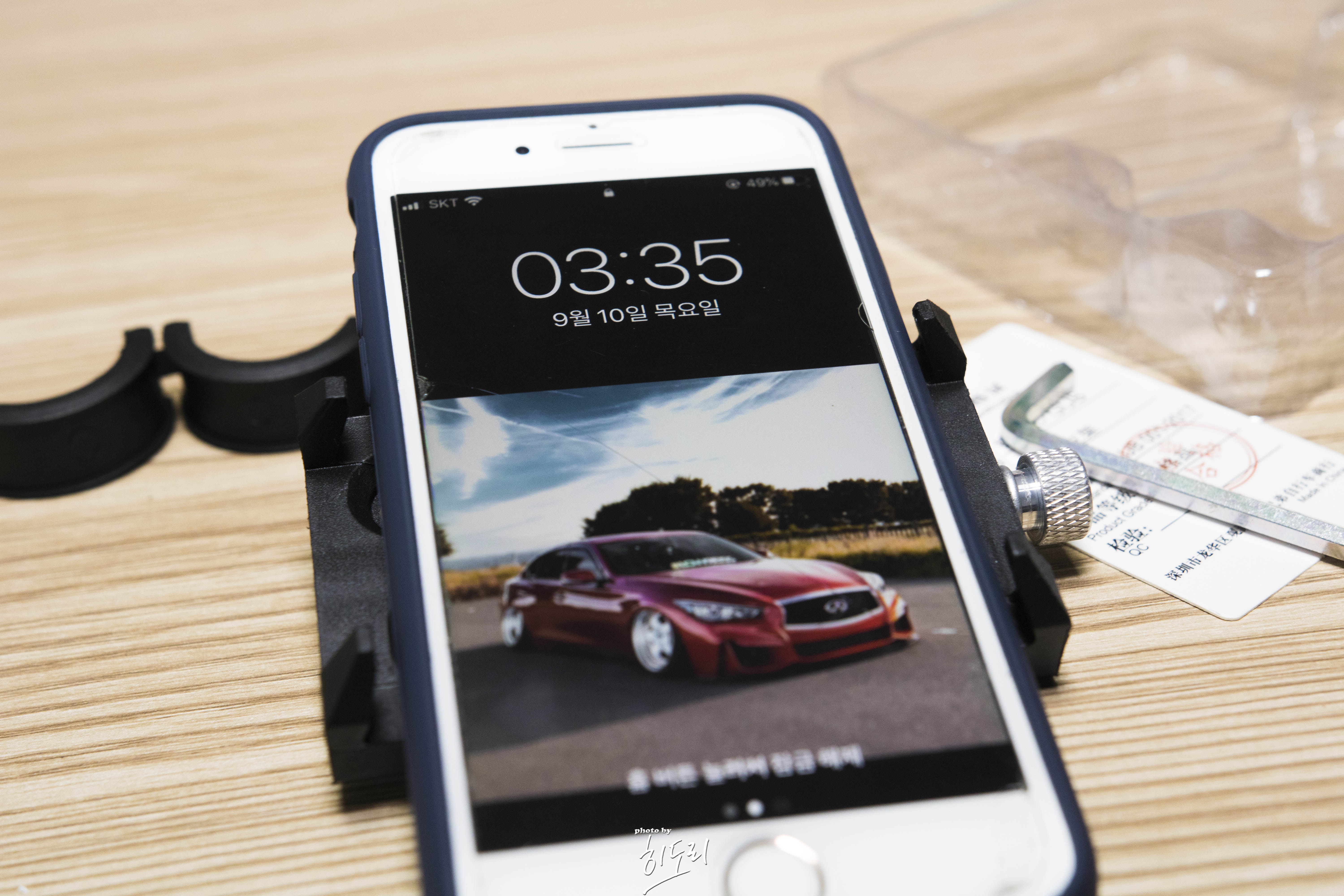 옆에 은색 나사로 거치대를 조절해 스마트폰을 거치하는 방식입니다.