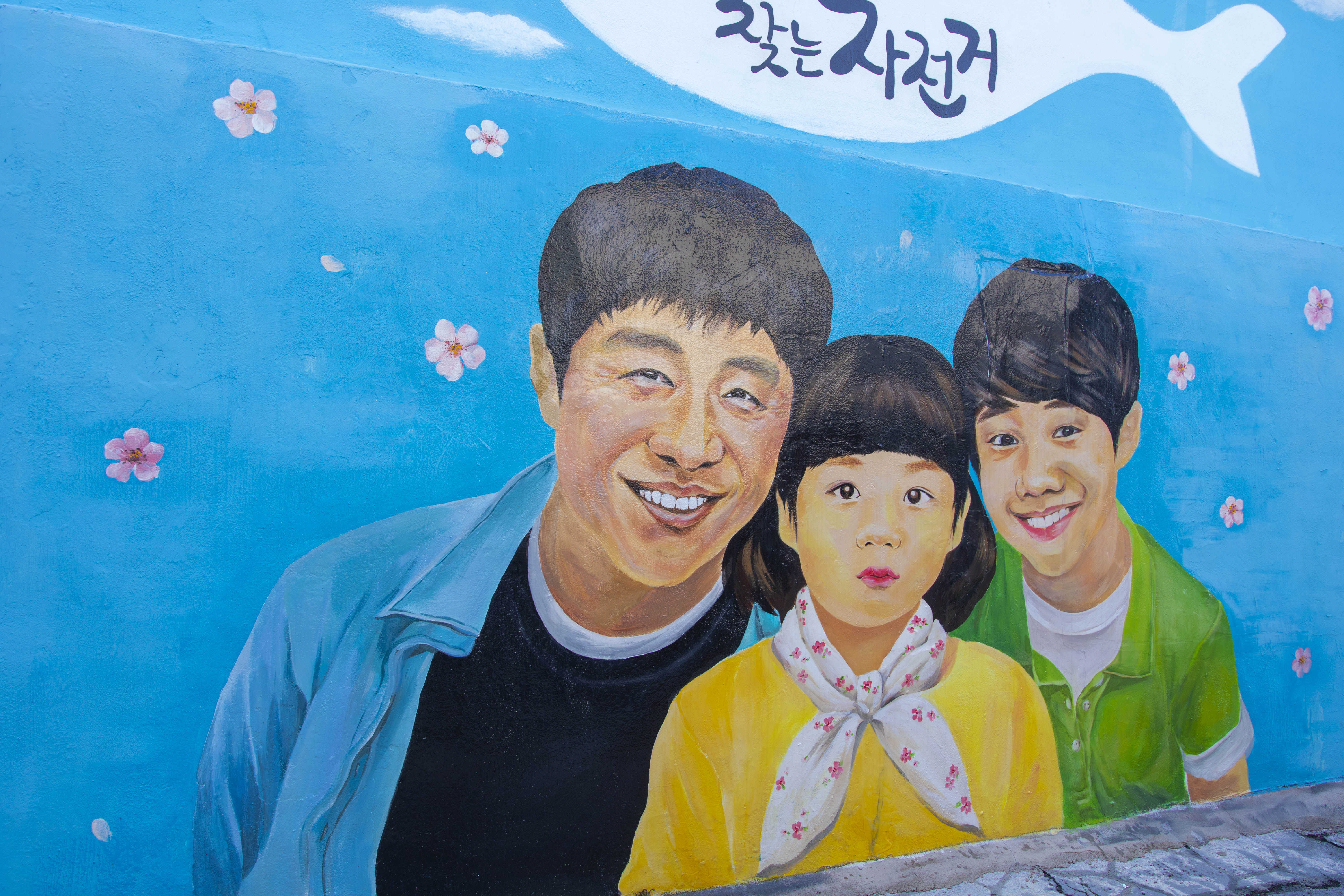 신화마을에는 '고래를 찾는 자전거'가 마을을 배경으로 영화를 제작했었는데 그 기념으로 배우들이 그려져 있는 벽화도 있었습니다.