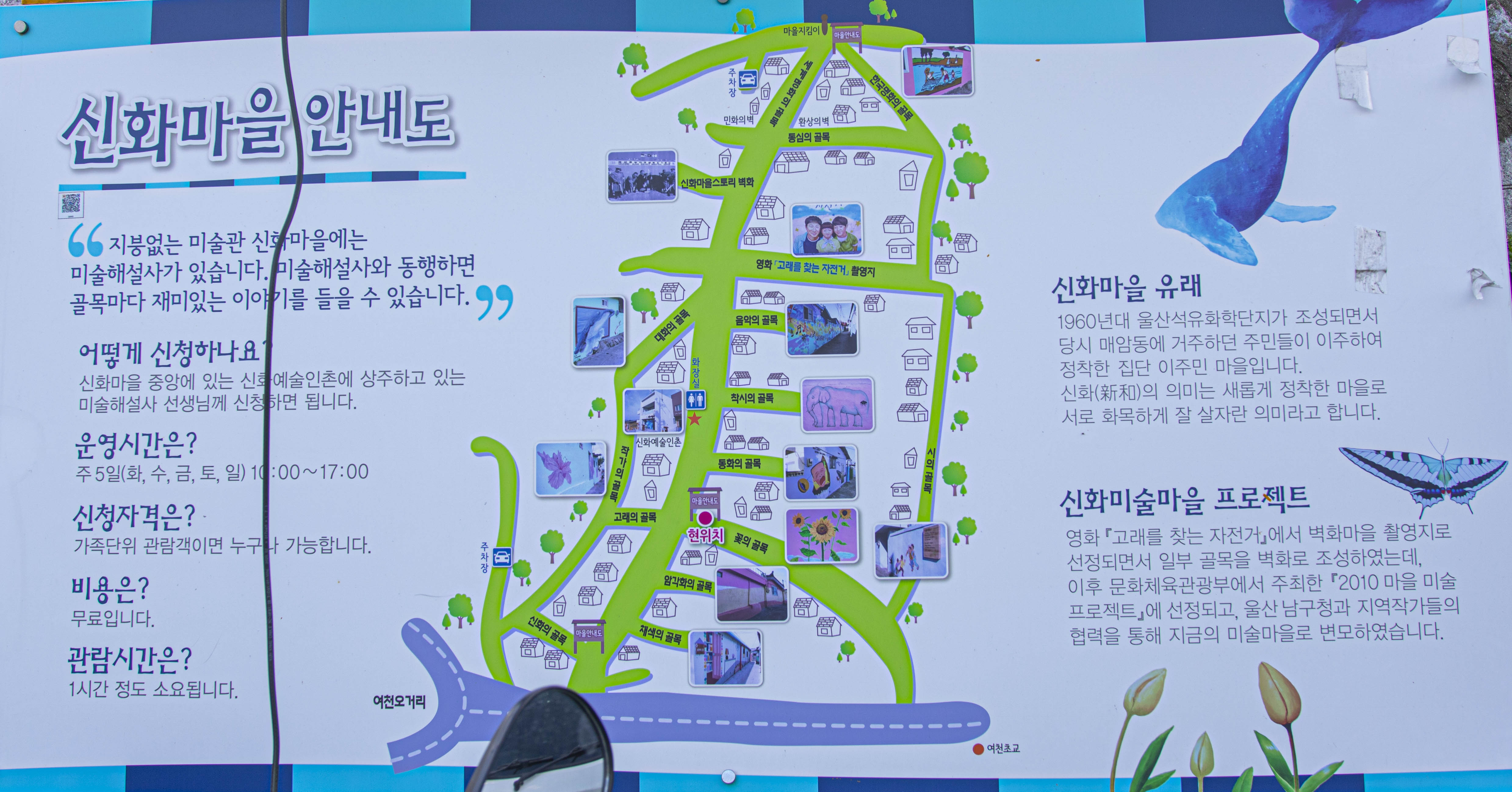 신화마을은 1960년대에 울산공단의 형성으로 삶의 터전을 잃은 사람들을 위해 만들어진 공단 이주민촌입니다. 울산 인근 도시인 부산에 위치한 벽화마을들과는 마을이 생기게 된 이유가 살짝 틀리죠.