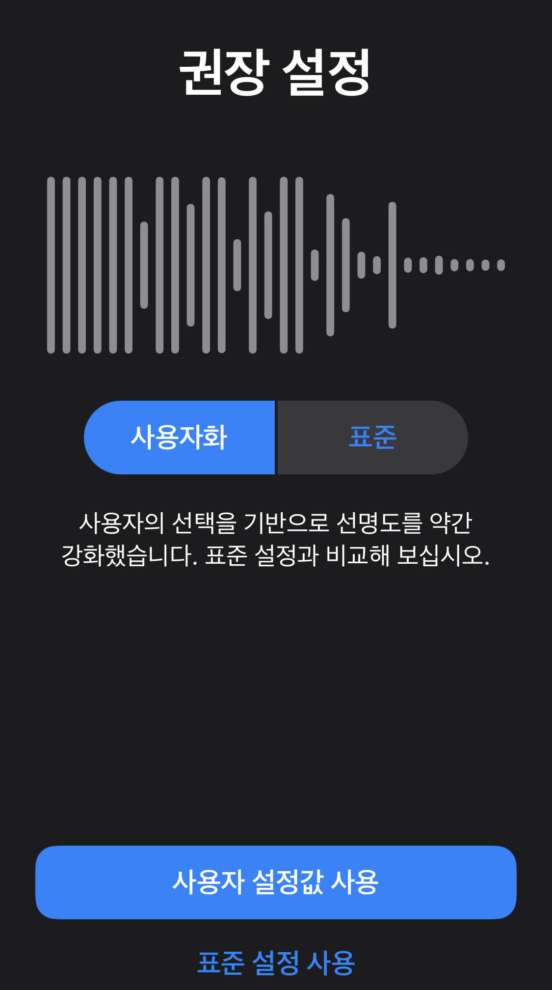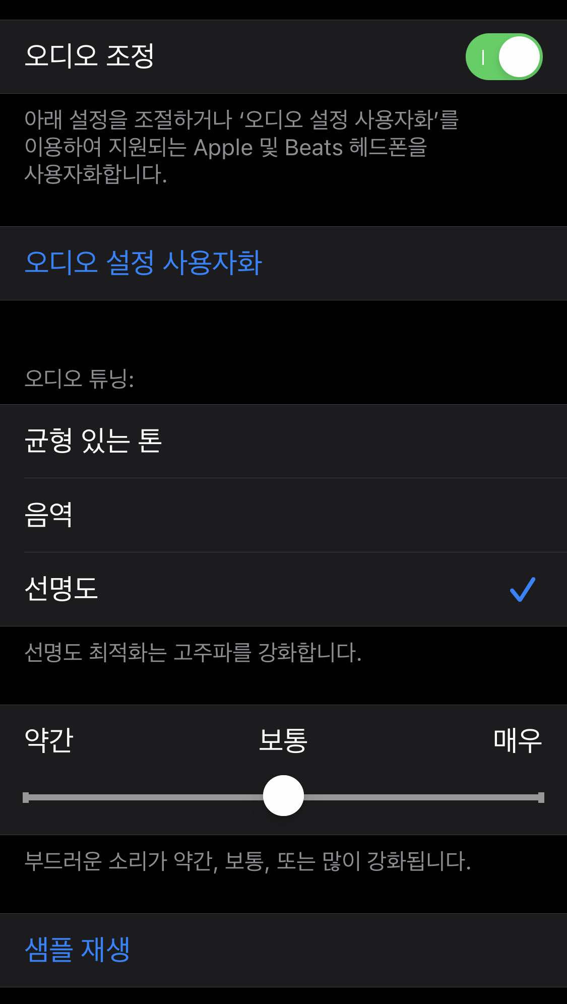 아무튼 일반 에어팟인경우 오디오조정을 통해 사용자의 청력에 알맞게 튜닝을 할수가 있습니다. 작은소리를 증폭시켜주고 개인별 청력에 맞게 음향을 조정할수 있게 하는 기능이죠.