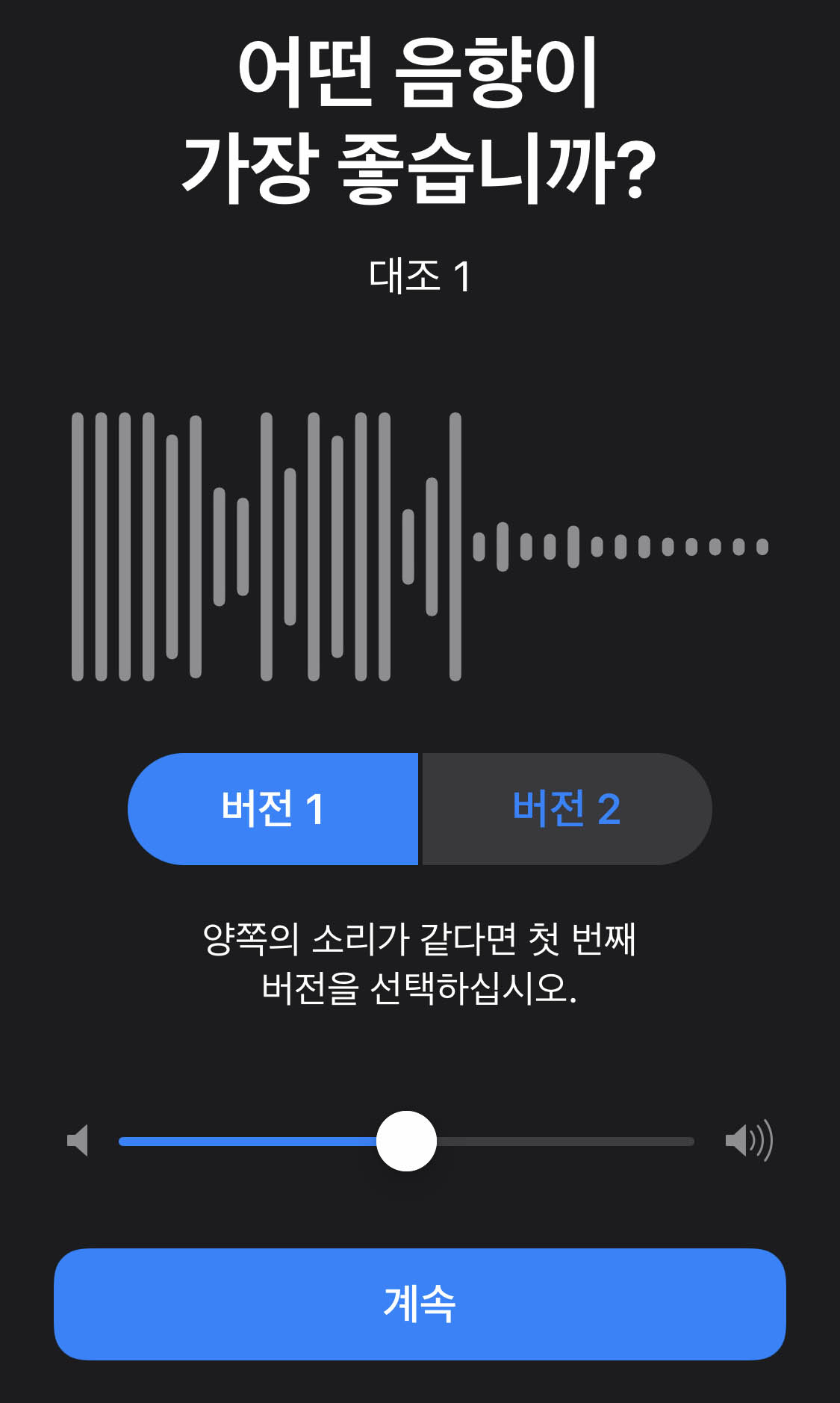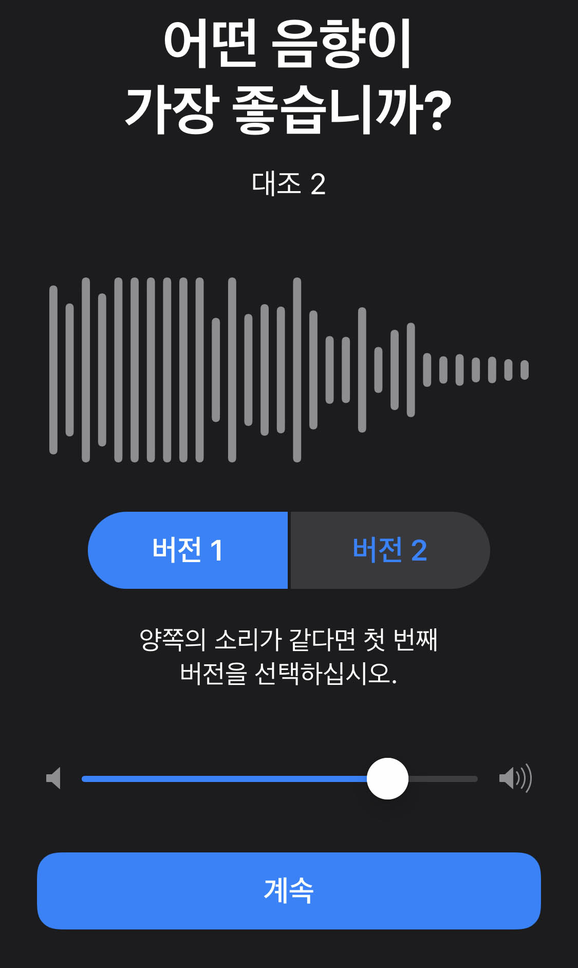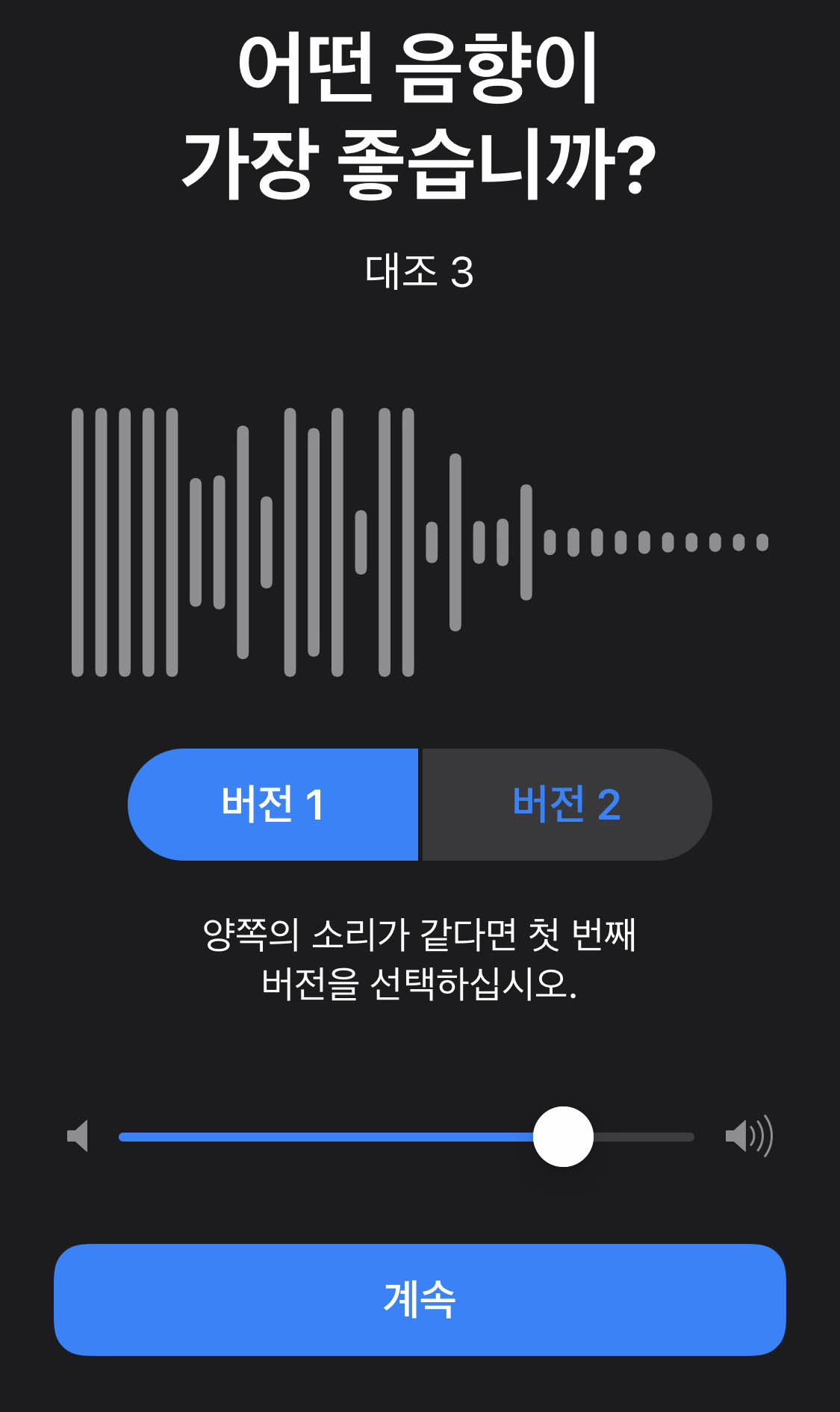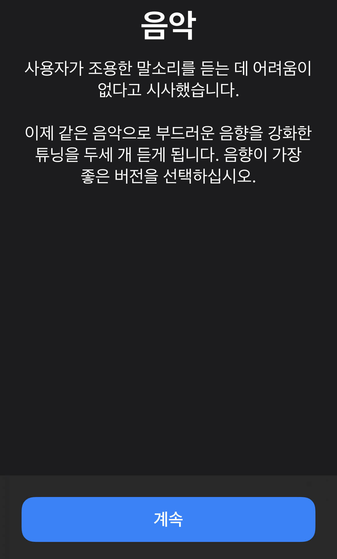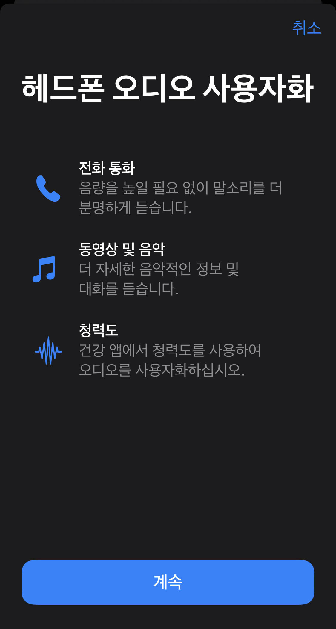 오디오 조정은 음악소리를 들으면 하나하나 조정을 해야하기에 조용한 장소에서 에어팟을 착용하고 설정을 하시면 됩니다.
