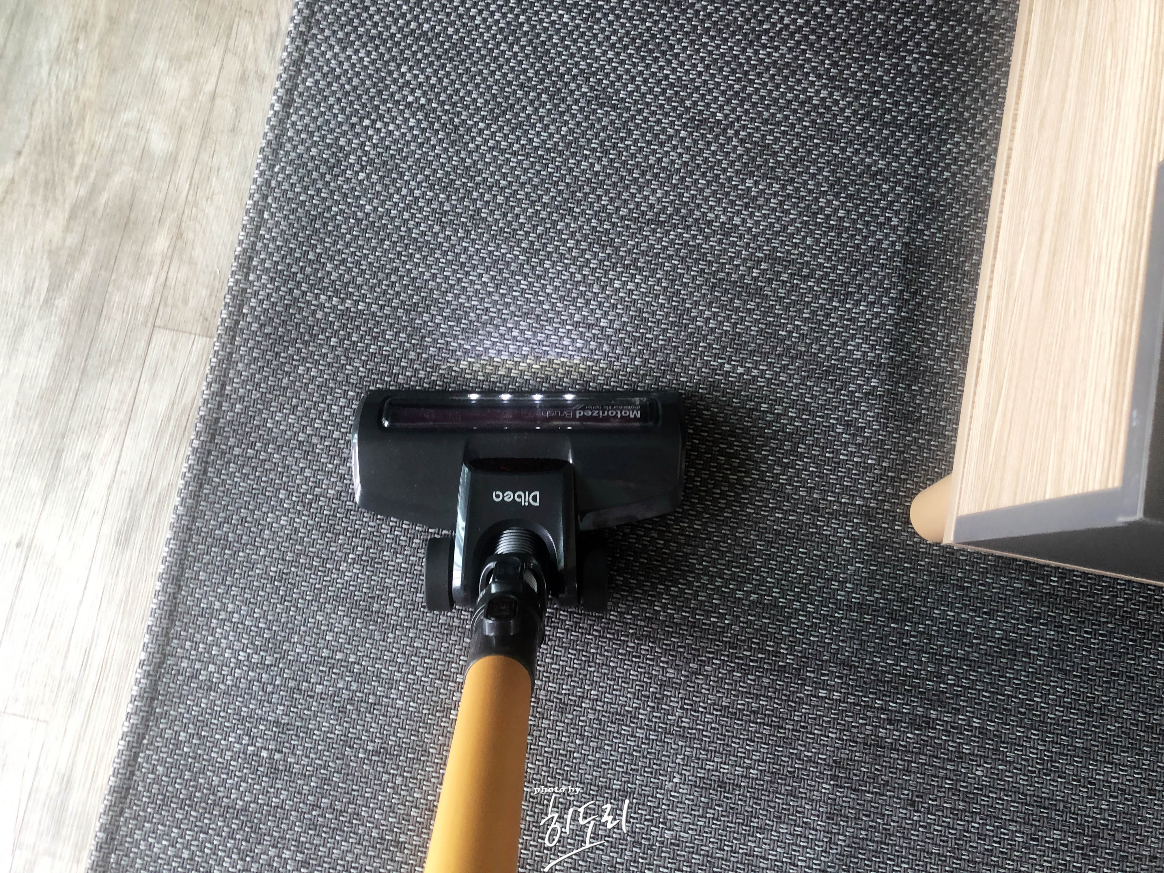 메인 전동 롤러브러쉬가 장착되어 있는데 브러쉬모가 일반 브러쉬모,카펫브러쉬모 일체형이라 일반 바닥을 청소를 하다가 카페트도 그냥 청소기로 쓱 밀어주면 되거든요.