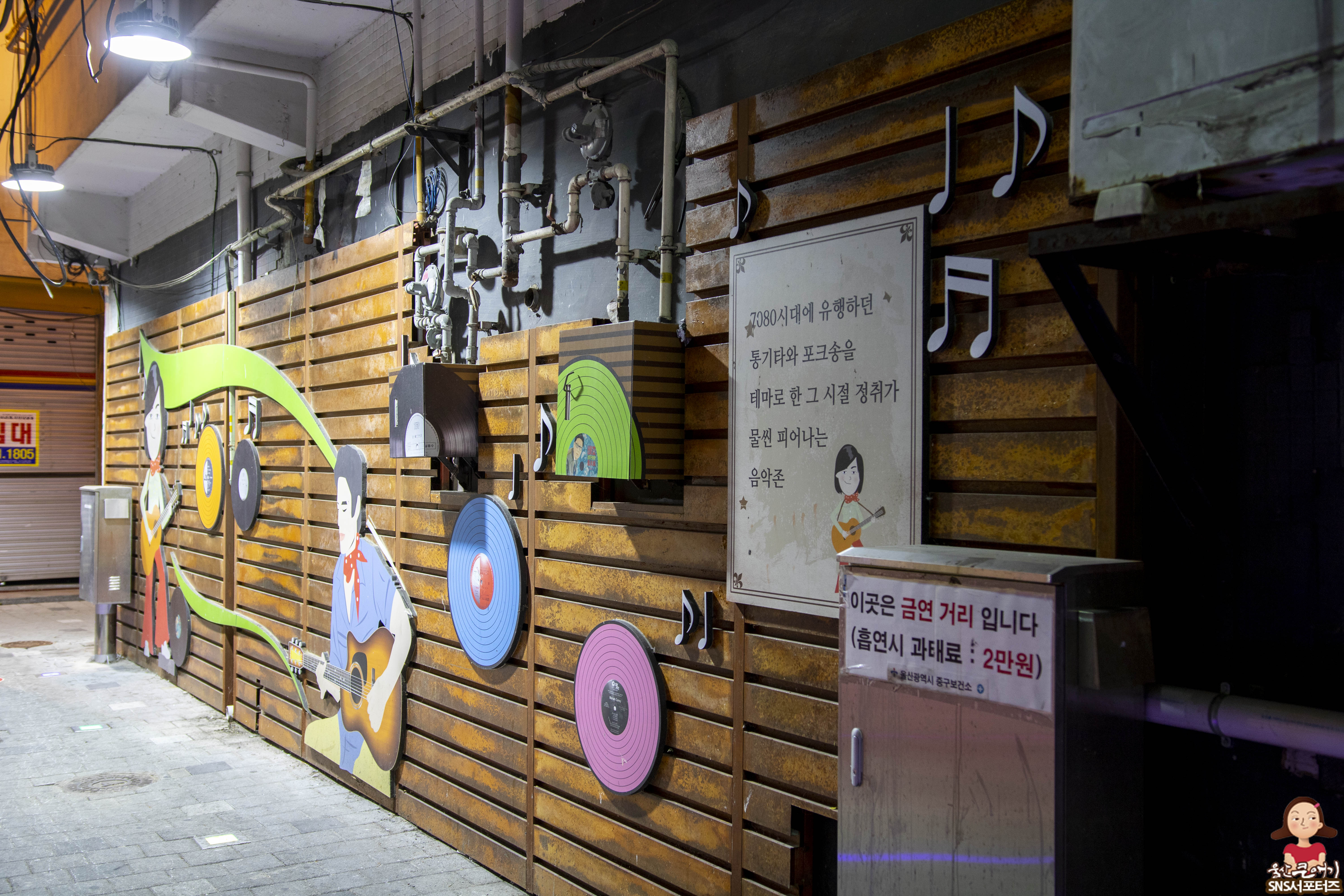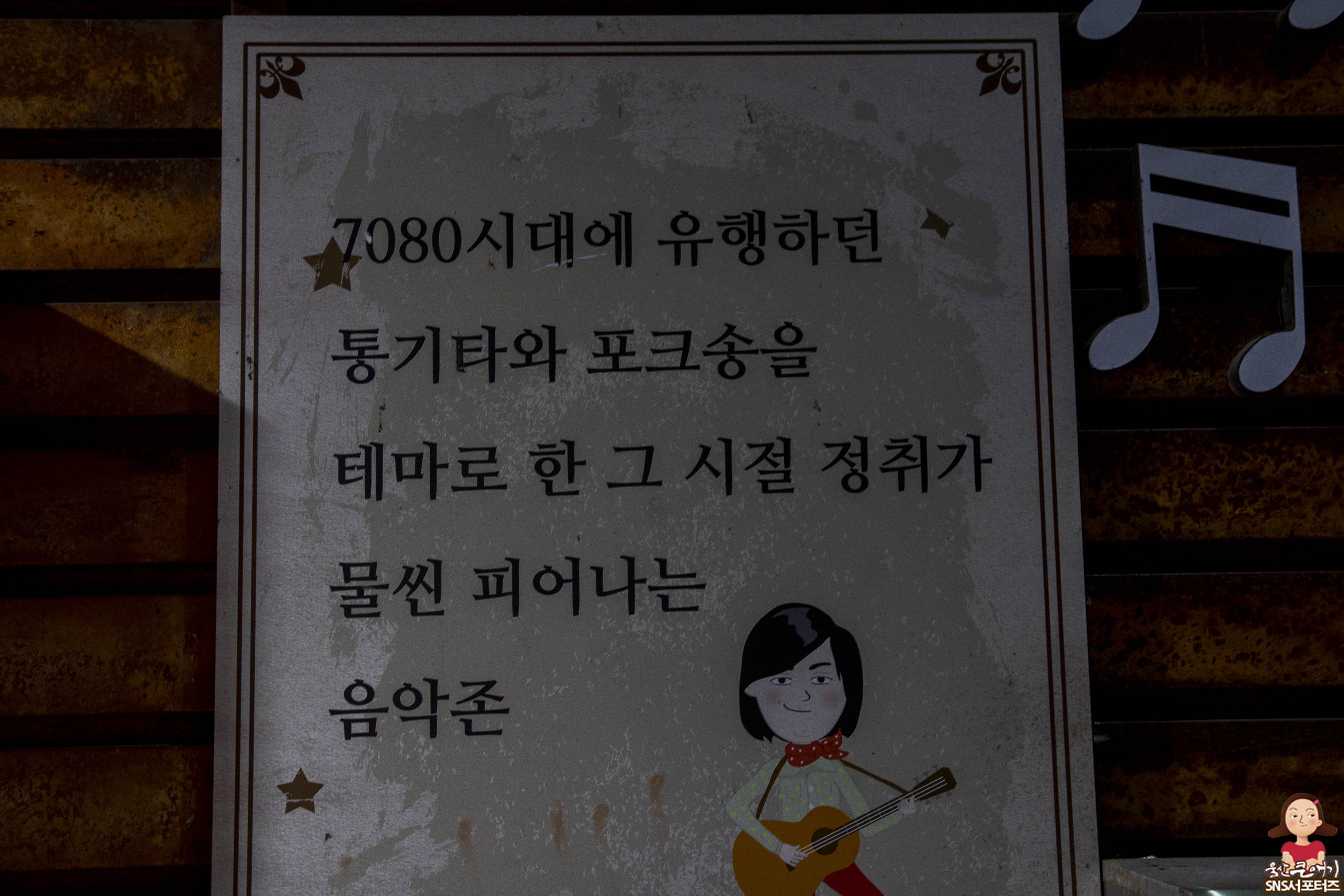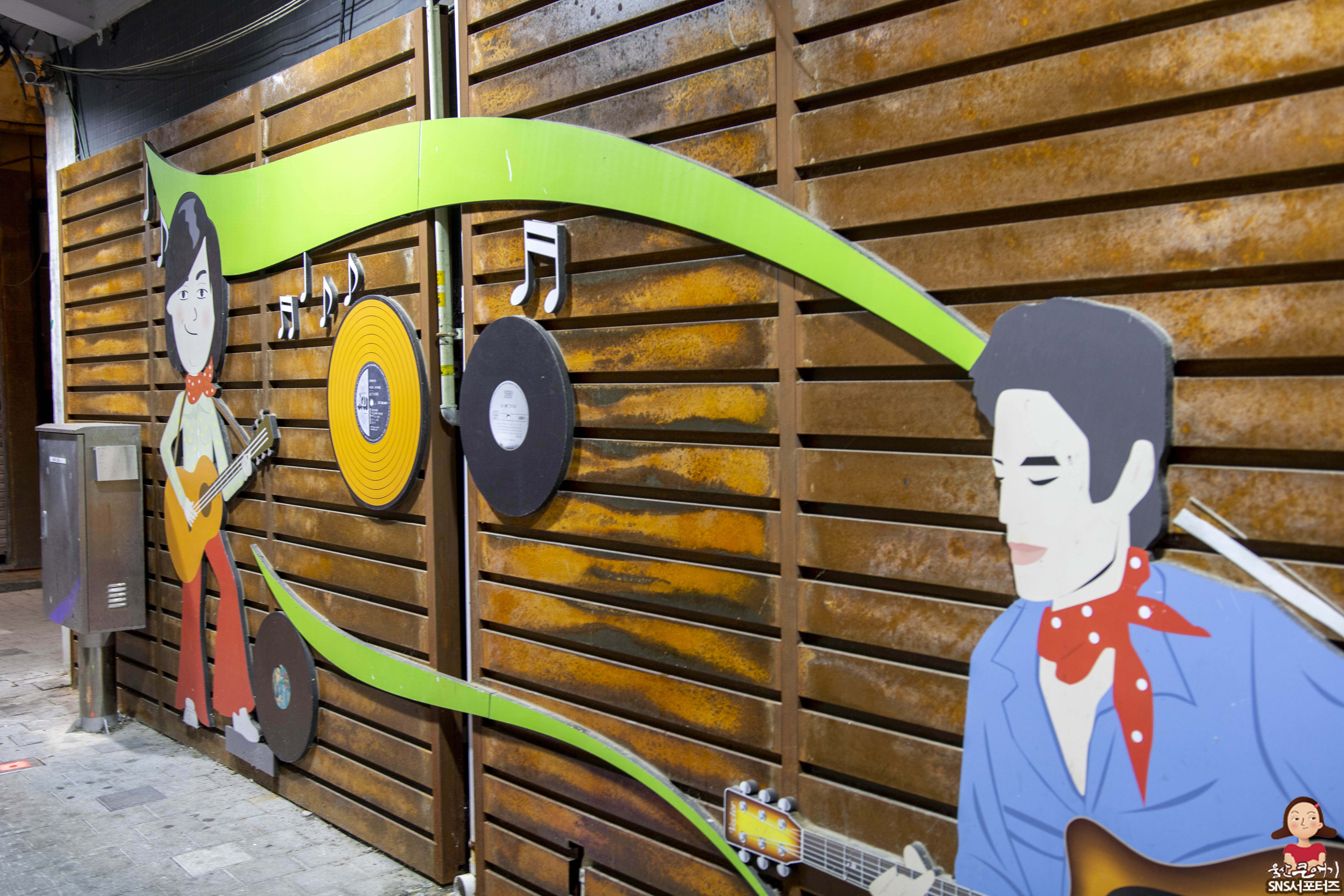 음악존 맨발의청춘길은 7080시대에 유행하던 통기타와 포크송을 테마로 한 골목길 입니다.