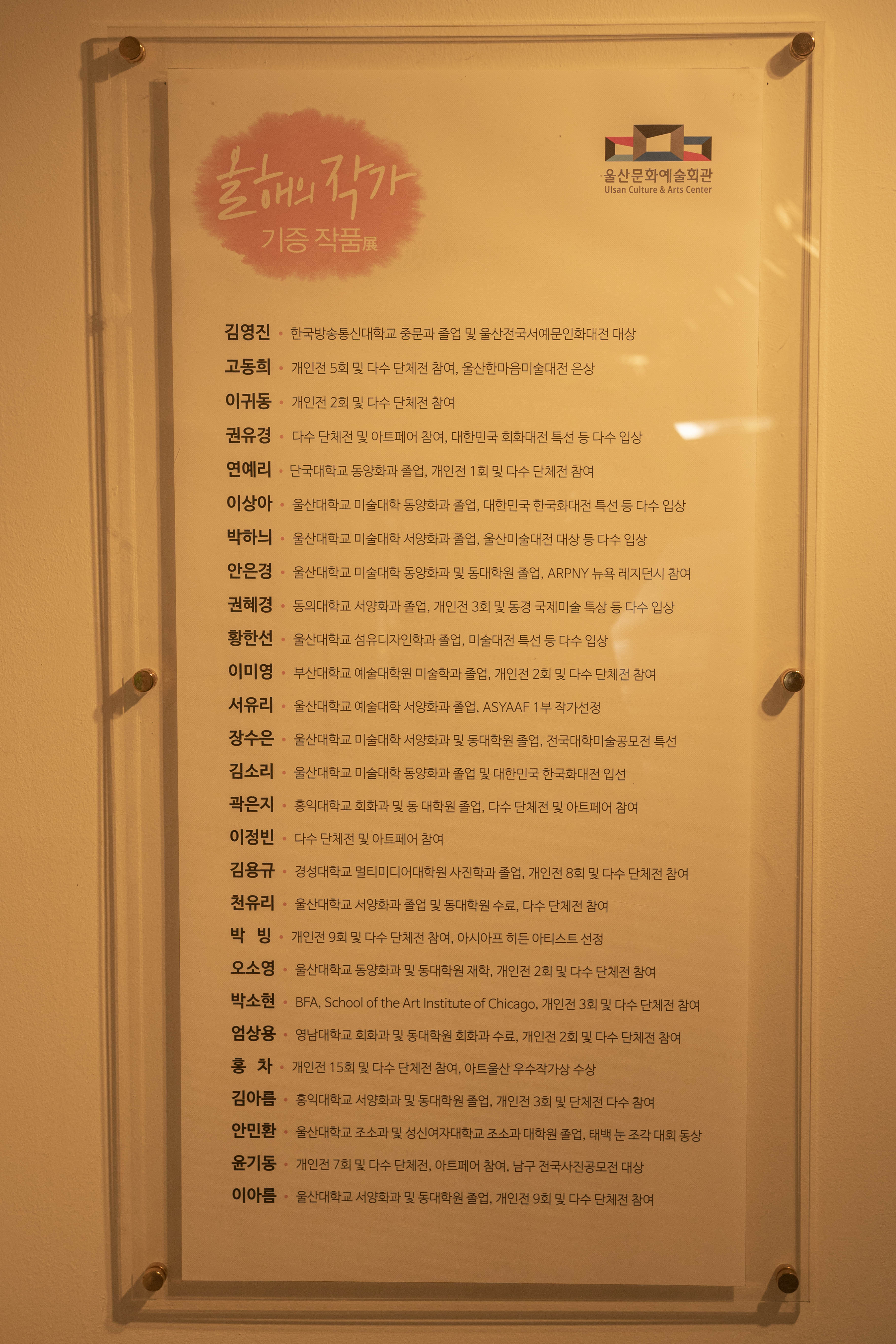 '올해의작가 기증작품전'은 울산에서 활동 중인 실력 있는 젊은 작가들에게 창작활동의 동기 부여, 울산 사랑 자긍심 고취를 위해 매년 열리고 있는 작품전입니다. 매년 열렸던 기증작품전은 일반 시민, 지역 젊은 작가들의 큰 호응을 받았고, 지역작가들에게 자신의 작품을 많은 사람들에게 알릴수 있는 소통의 장 전시라고도 할수가 있습니다.