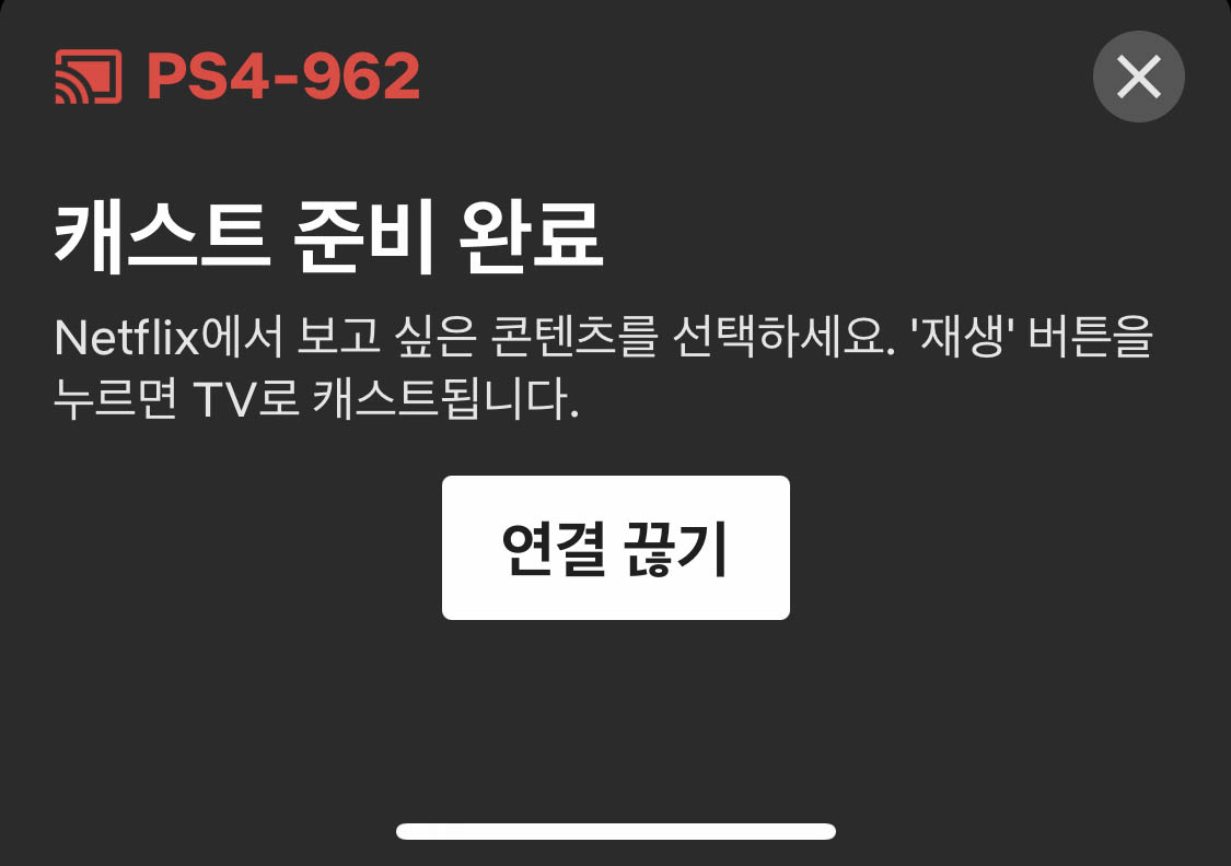 PS4와 캐스트 준비 완료 라는 문구와 함께 넷플릭스에서 보고 싶은 콘텐츠를 선택하세요. '재생'버튼을 누르면 TV로 캐스트 됩니다. 라고 뜹니다.