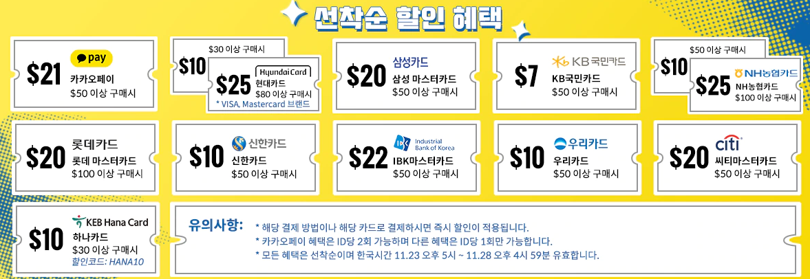 현대카드 80불 이상 구매시 25불 할인, 30불 이상 구매시 10불 할인