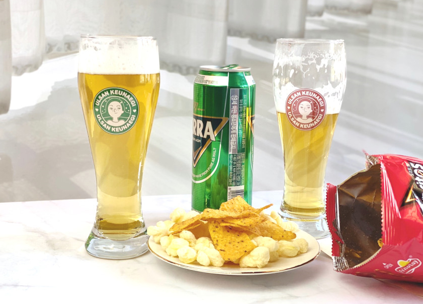 자주와 그린색의 큰애기 로고가 있는 맥주잔인데~ 울산의 대표캐릭터가 그려져 있어서 선물용으로도 참 좋답니다.