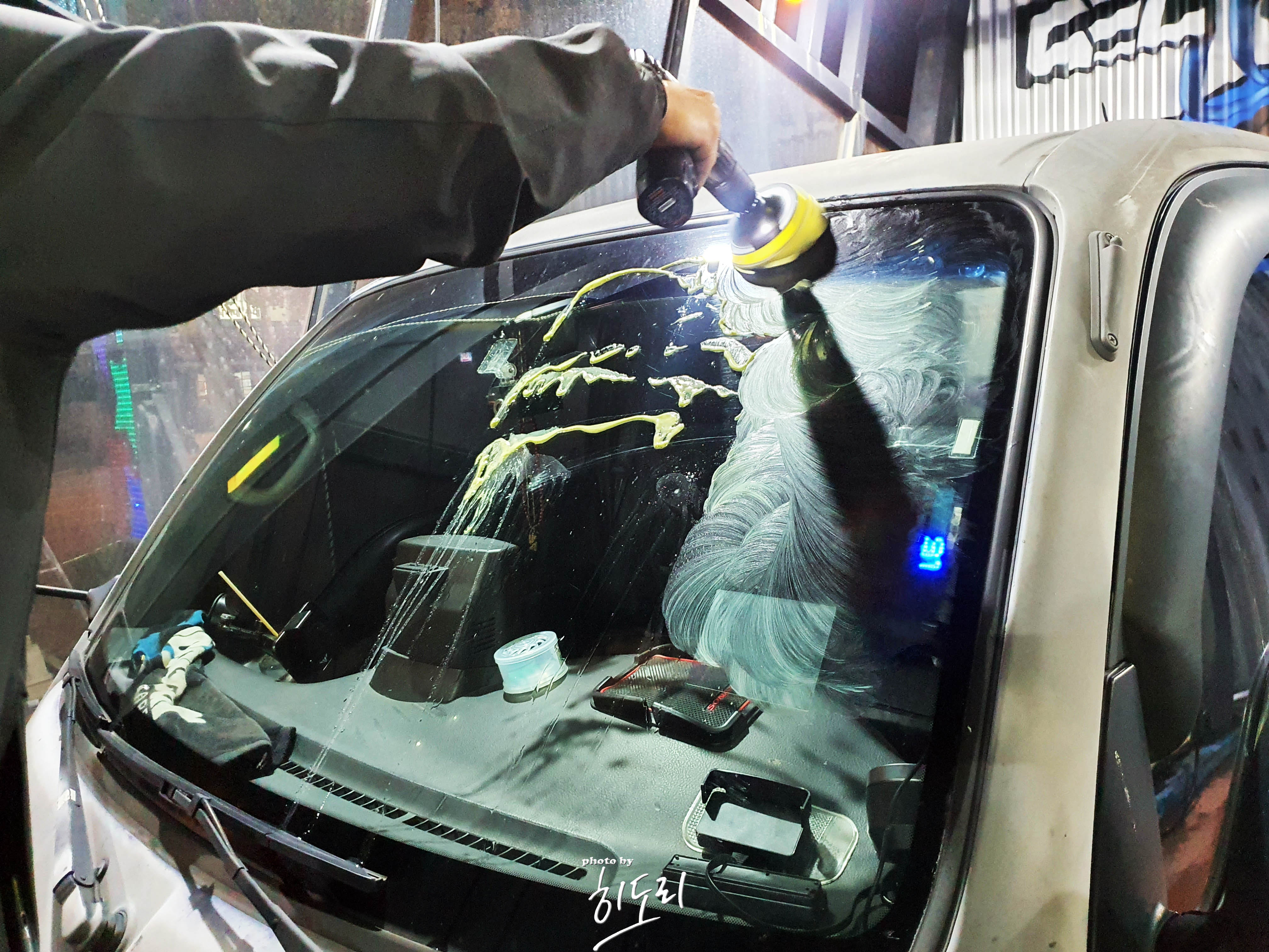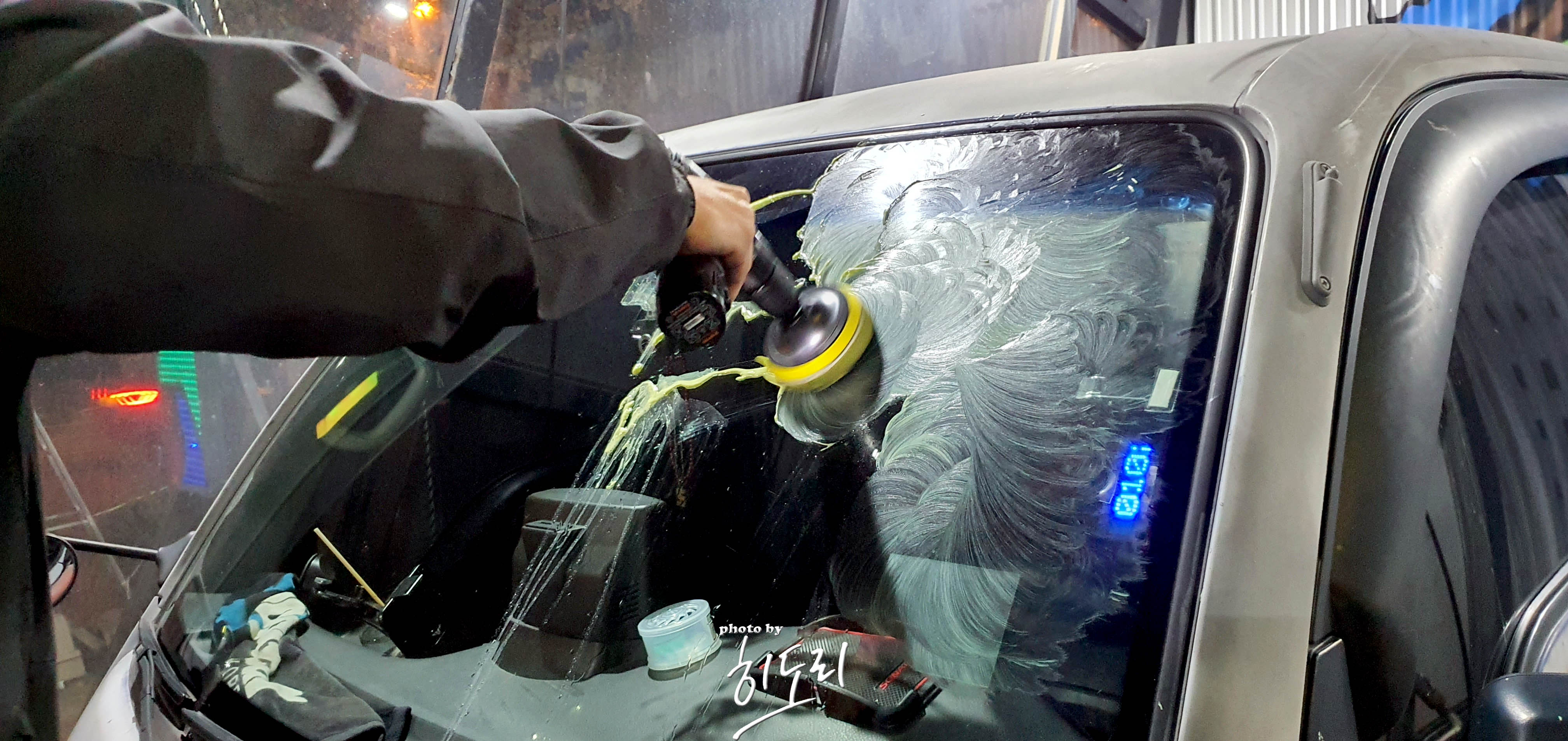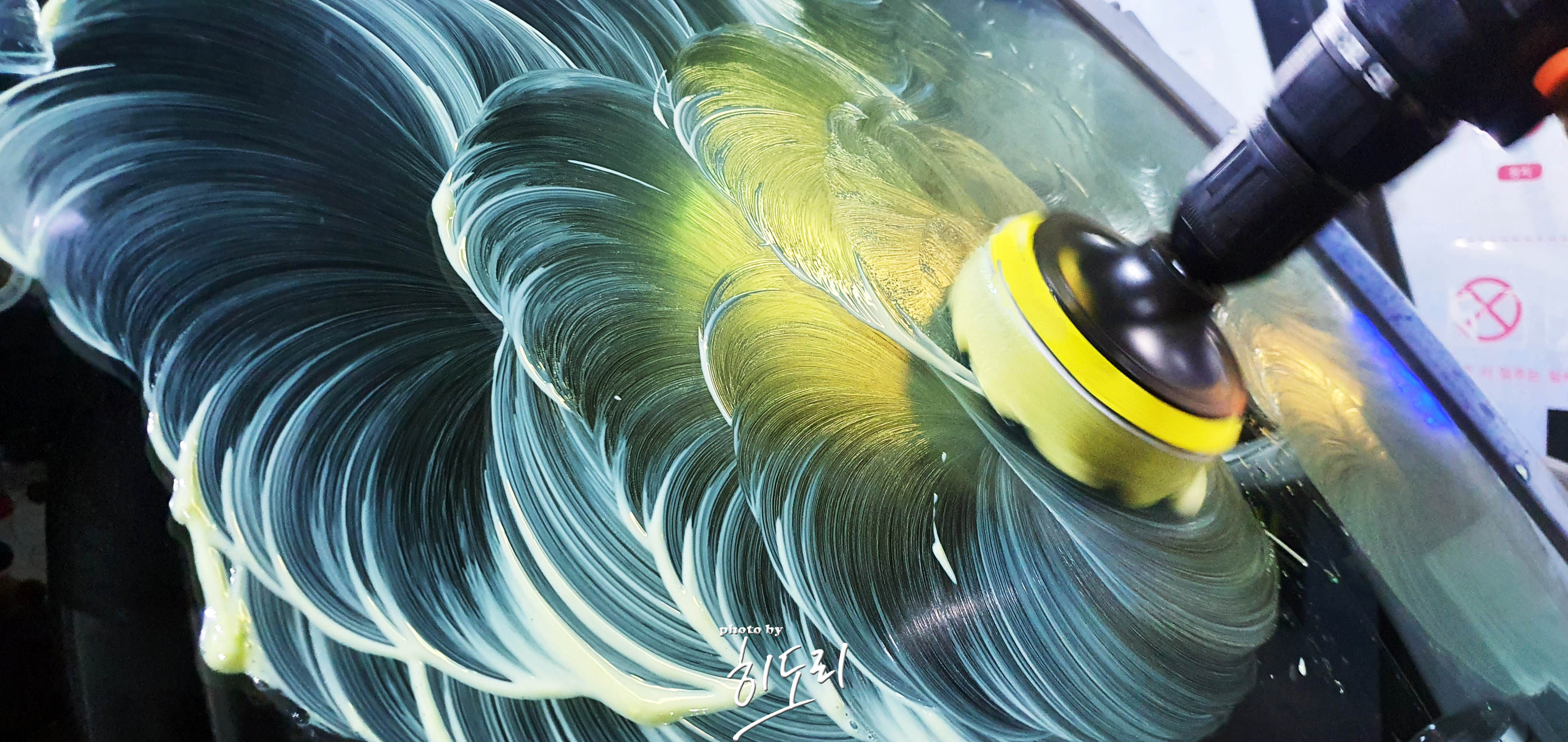약품을 잘 흔든 후 시공할 유리에 바르신 뒤 전동드릴 폴리싱 패드를 이용해 발라줍니다.