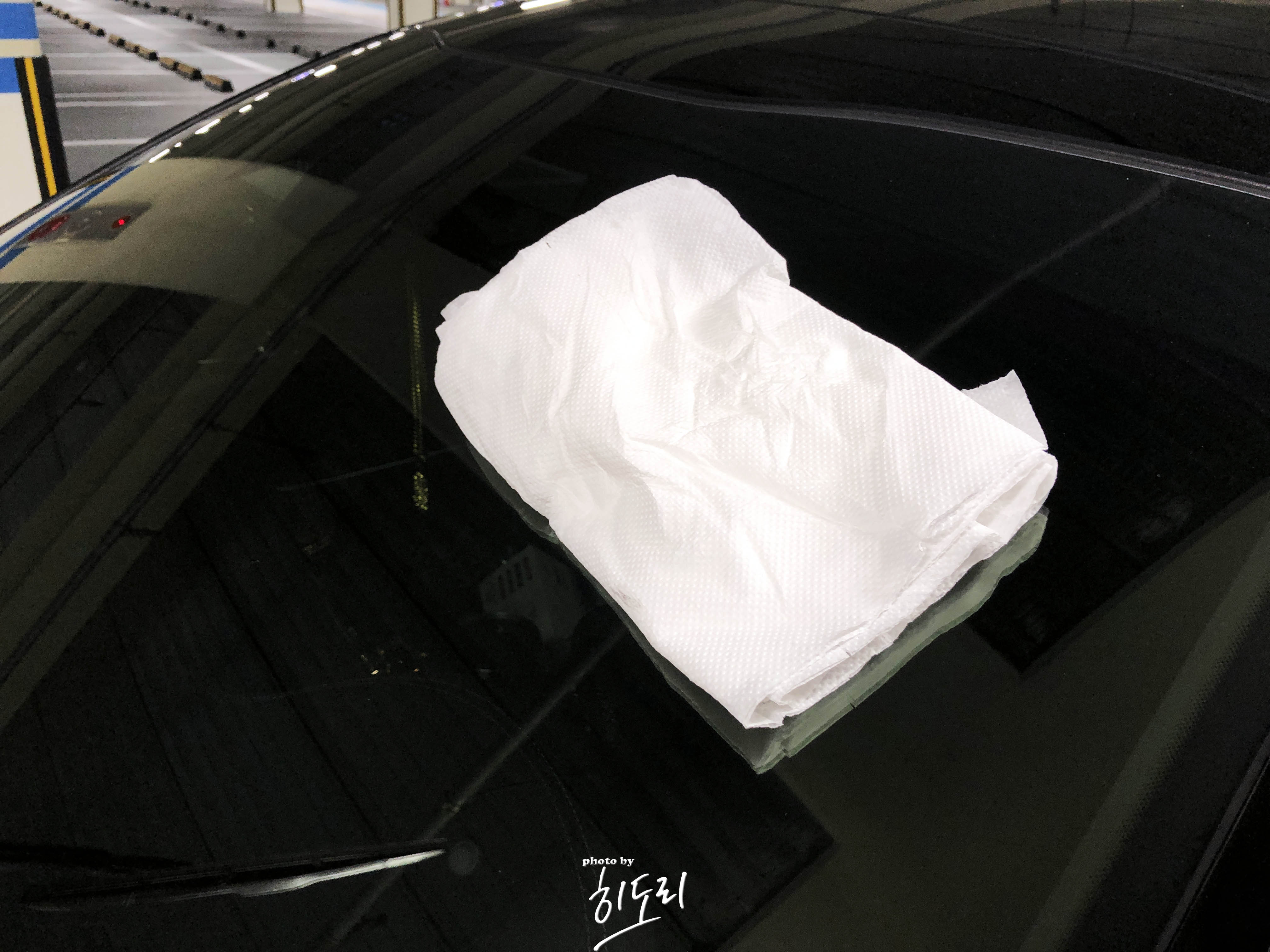 먼저 유리면에 물기나 먼지가 없는 상태로 만들기 위해 키친타월을 이용해 작업 할 유리면을 뽀득뽀득 닦아줍니다.