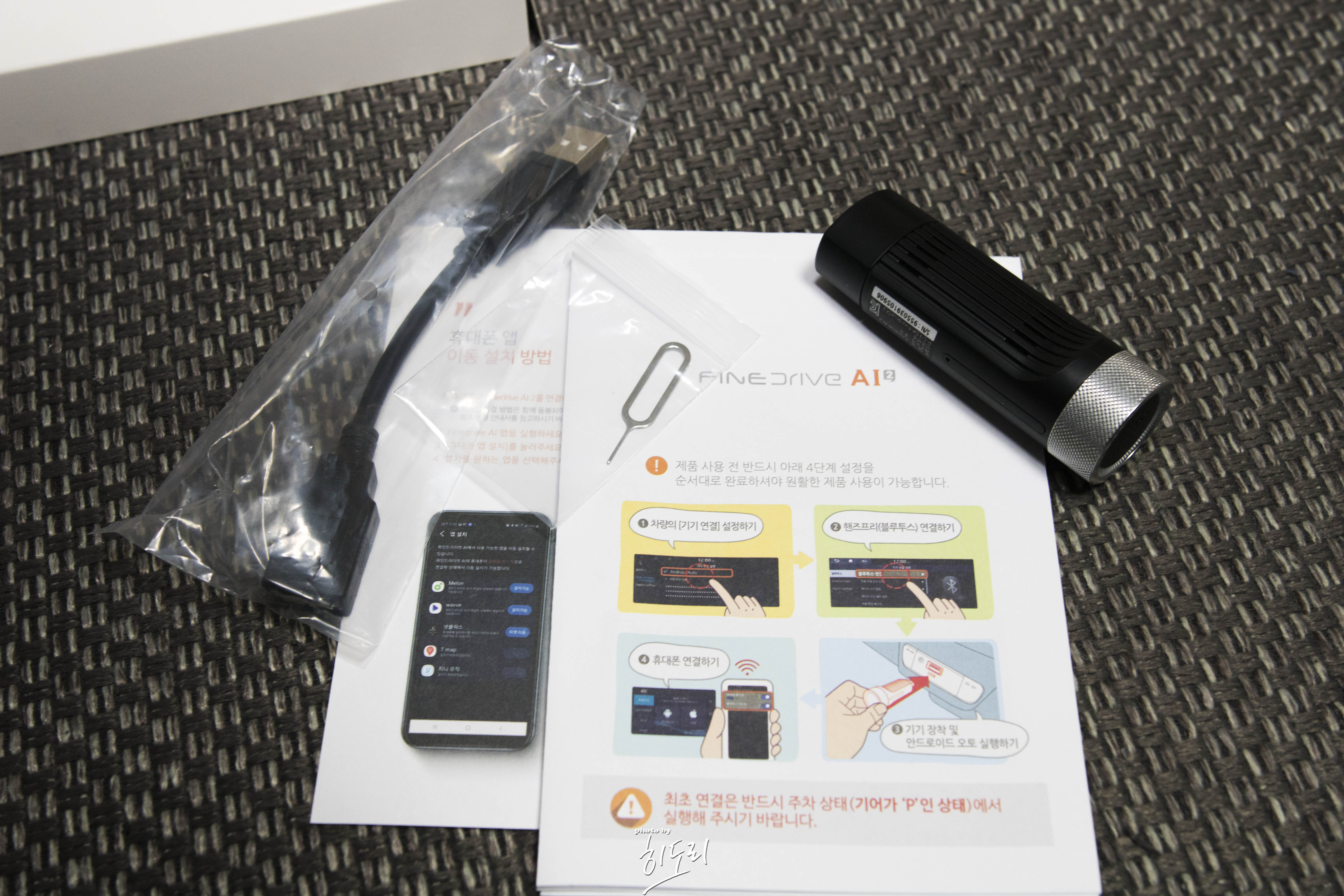 제품은 각종 설명서와 본품인 파인드라이브 AI2 스틱,분리핀, USB연장 케이블이 들어 있습니다.