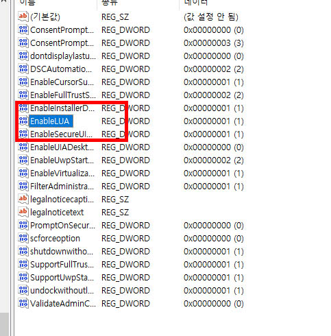 폴더 안 ENABLELUA을 더블클릭하시면 값이 1로 되어있는데 0으로 수정 해주시면 끝!