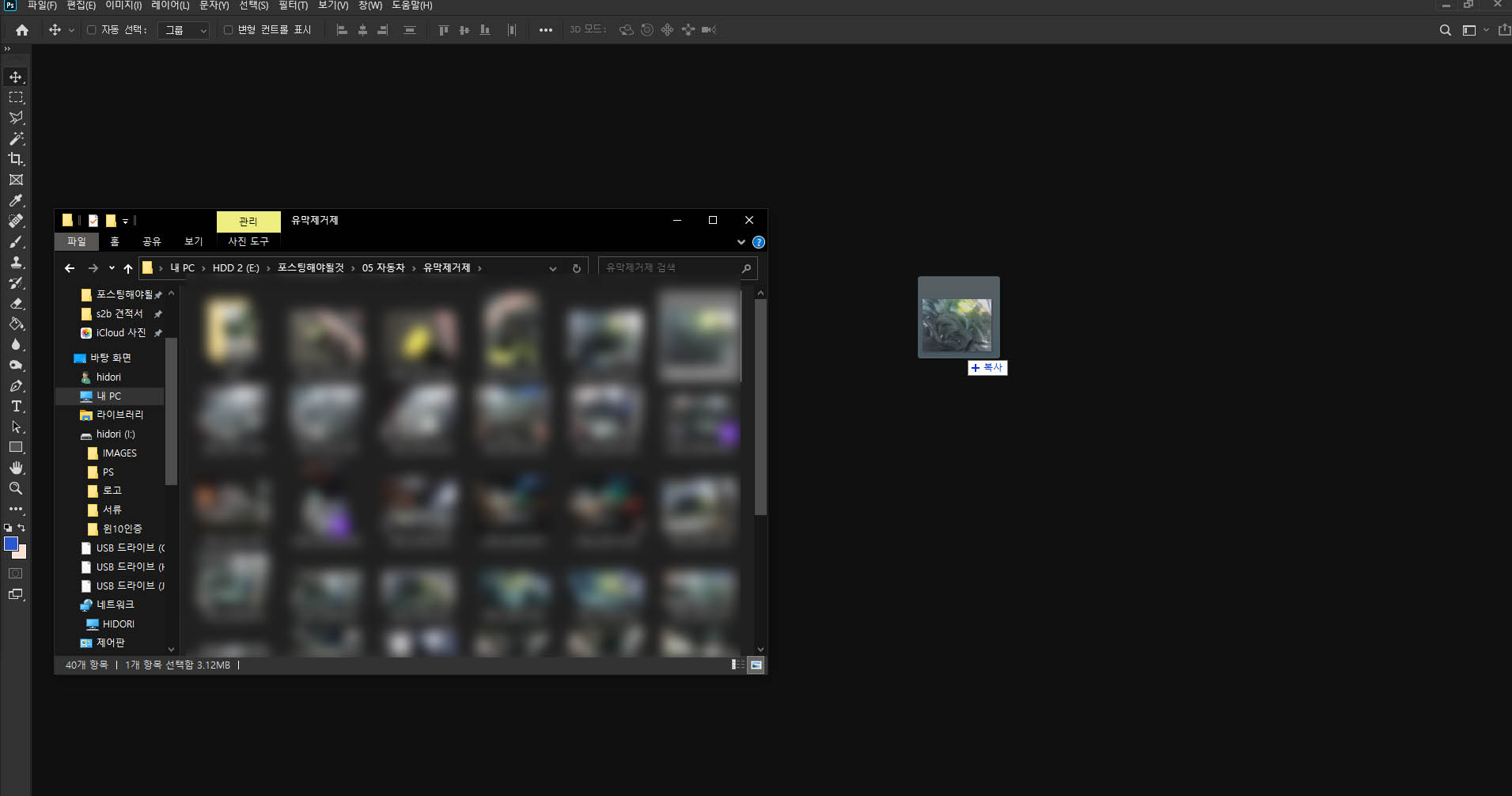 재부팅 하고 포토샵을 다시 실행해서 드래그를 해보시면 폴더에서 사진 이미지가 드랍이 되는것이 보이시죠?