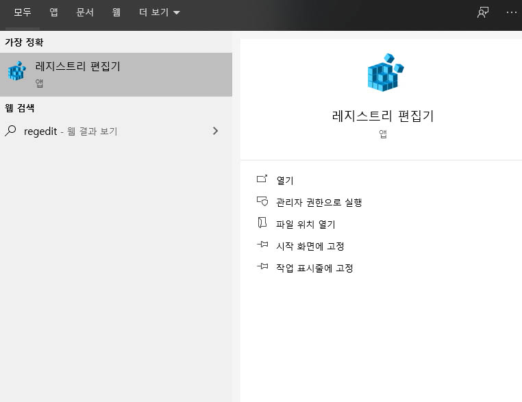 검색에서 regedit 입력하셔서 레지스트리 편집기를 불러와주세요.