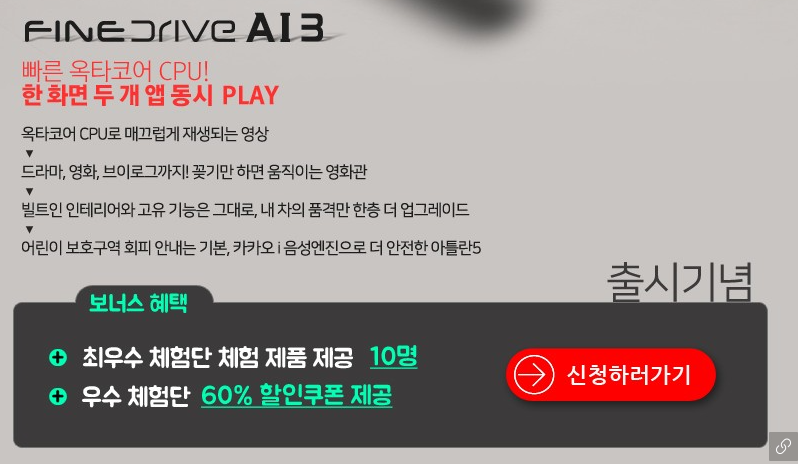 현재 파인드라이브 AI3 체험단을 모집중인데~ 차쟁이 답게 일단 지원 한번 해보고 여러분께 알려드리고 싶네요~