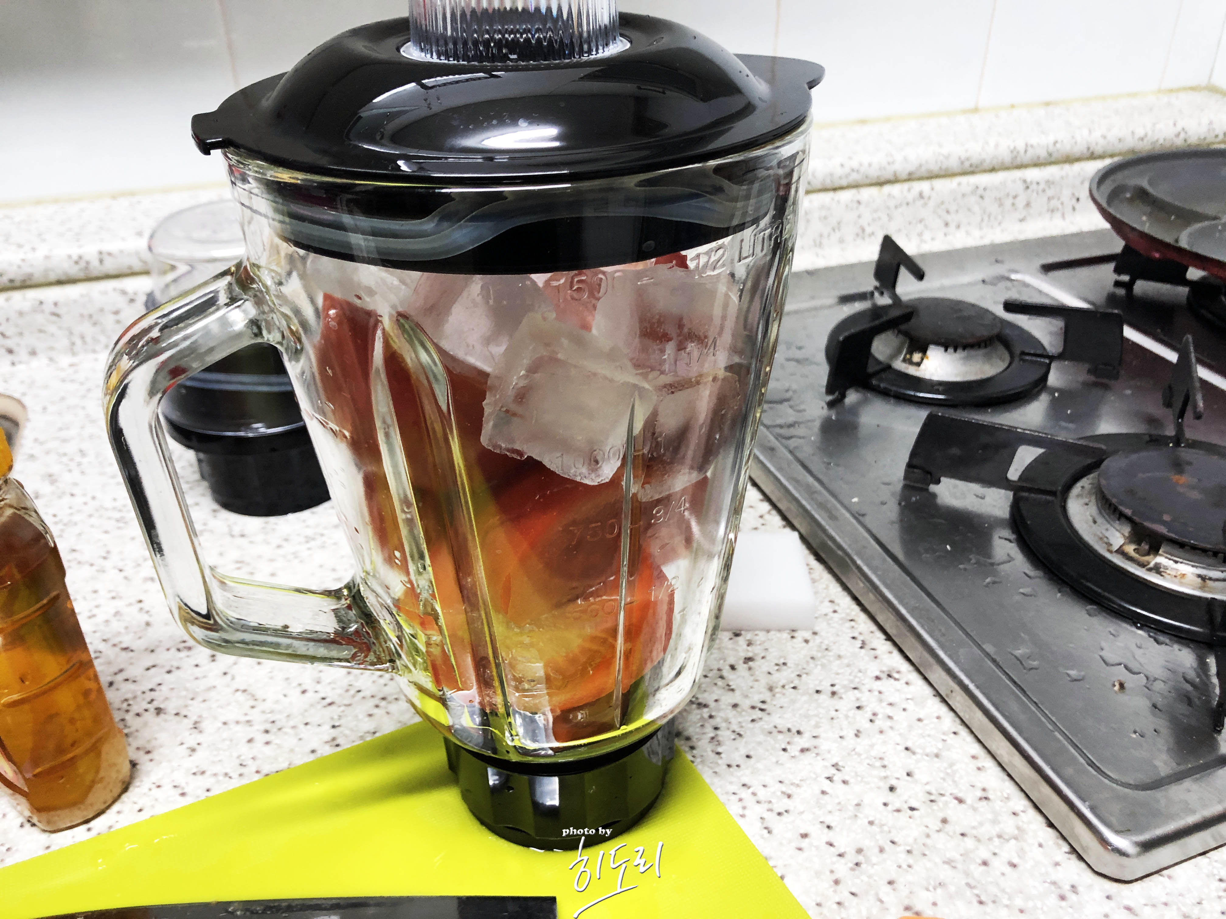 토마토 3개랑 얼음을 넣어서 열심히 믹서를 해봅니다.