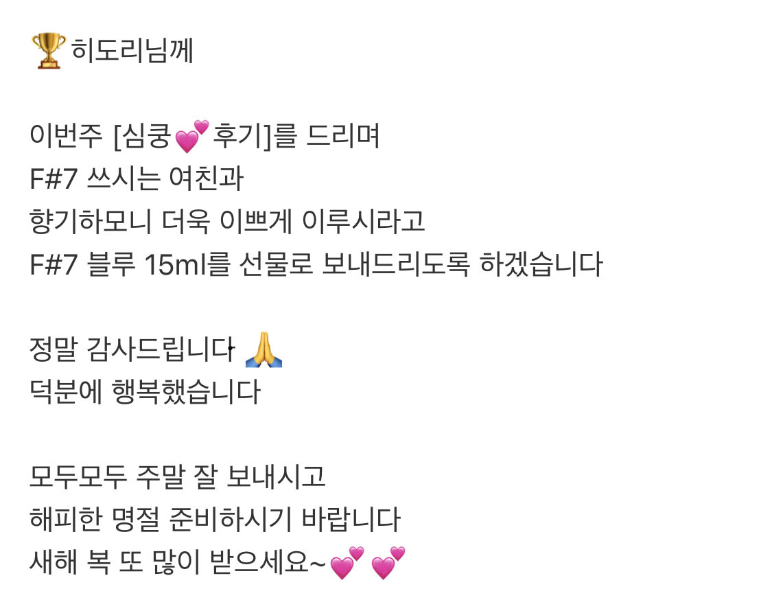 향기가 너무 좋아서 리뷰도 정상 가득히 썼더니 후기에도 당첨이 되어서 꽃집향수인 F#7 남자버젼인 F#7블루도 받았습니다.