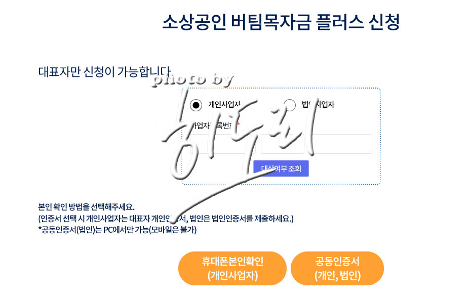 대표자 본인의 공인인증서나 본인휴대폰으로 본인확인을 하시면 신청이 가능합니다.