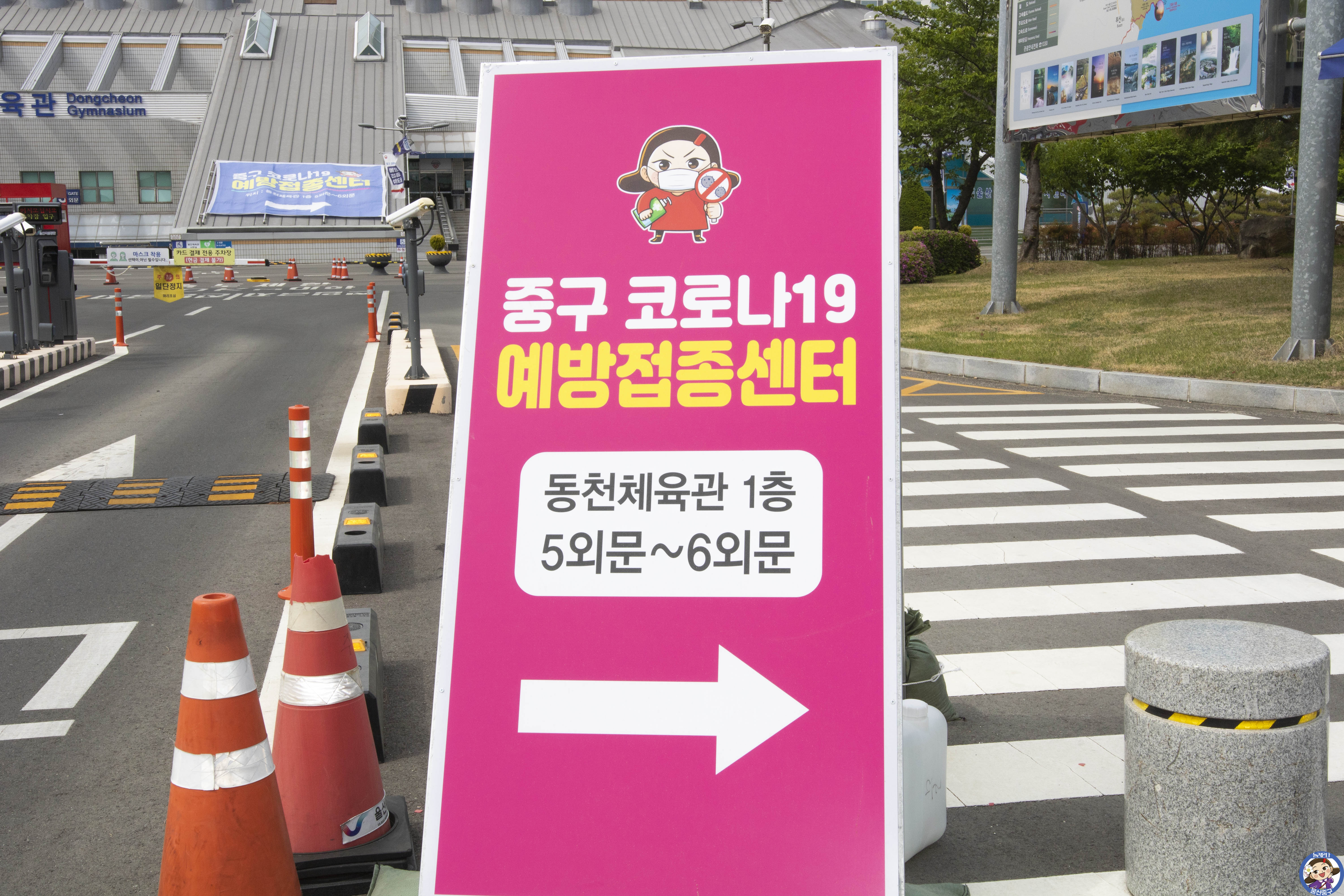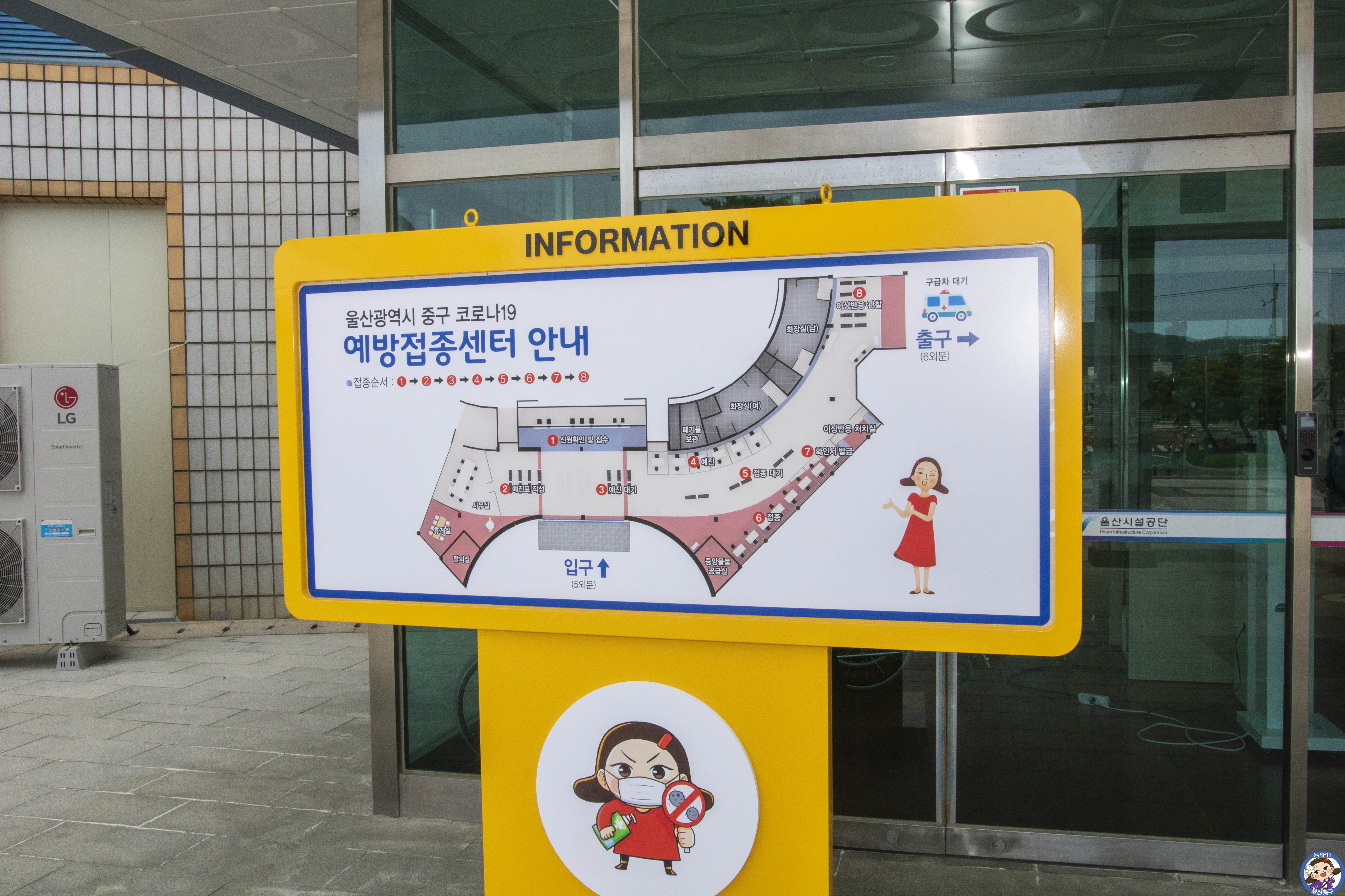 중구 예방접종센터에 도착하면 울산큰애기가 먼저 마중을 나와 예방접종센터 접종순서를 안내하고 있습니다.