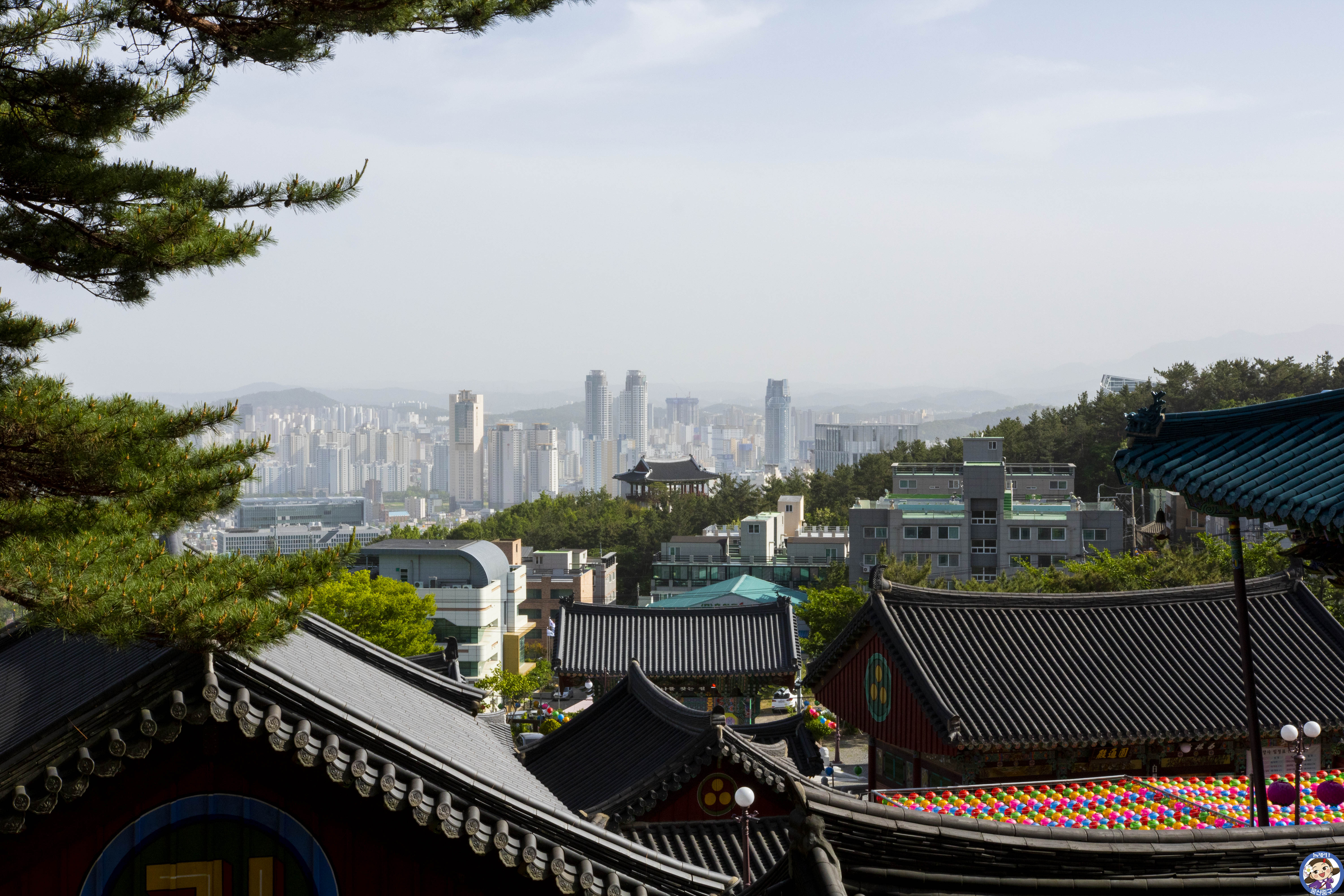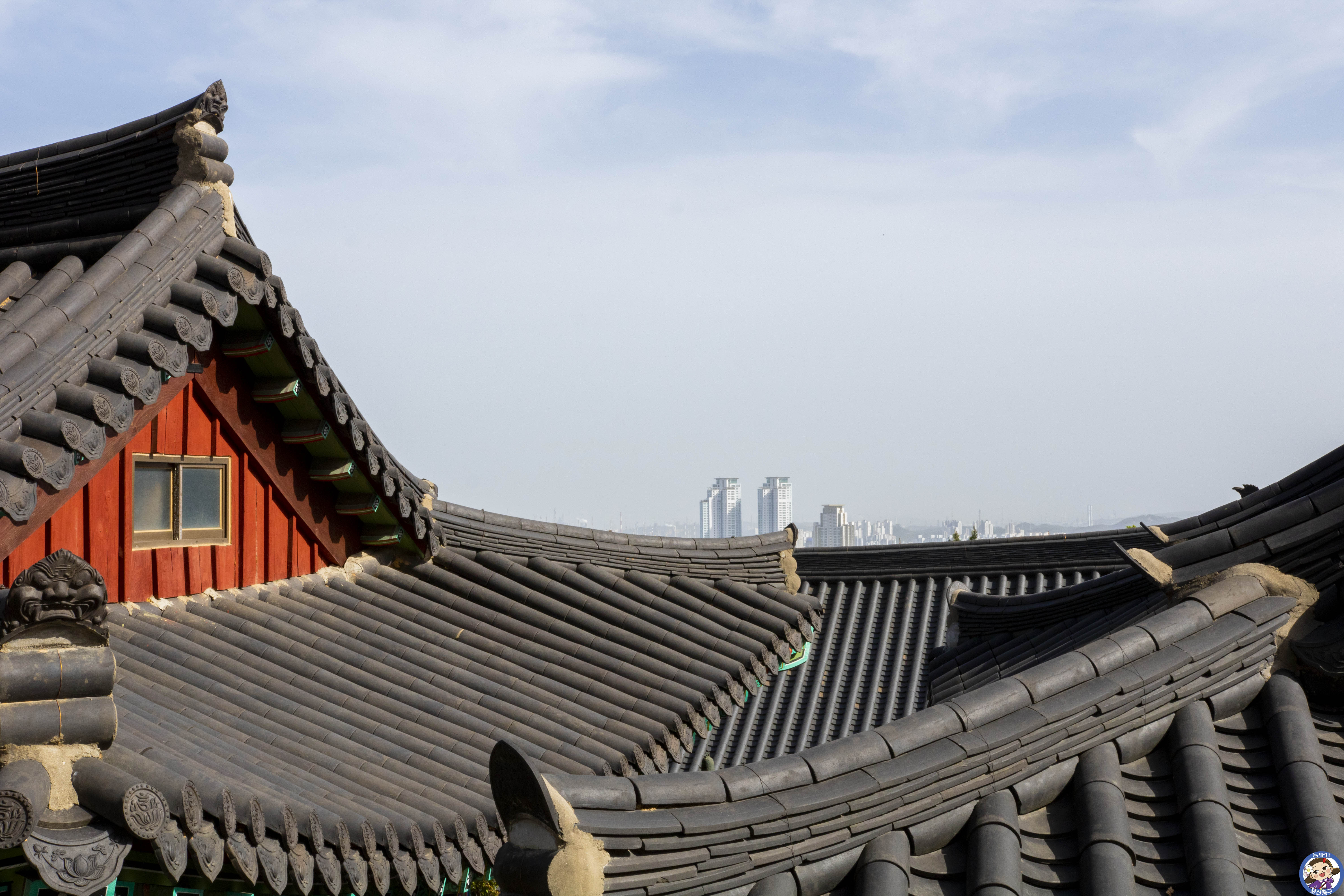 사찰의 지붕 끄트머리 넘어 보이는 높은 빌딩들의 모습이 참 이색적이죠?