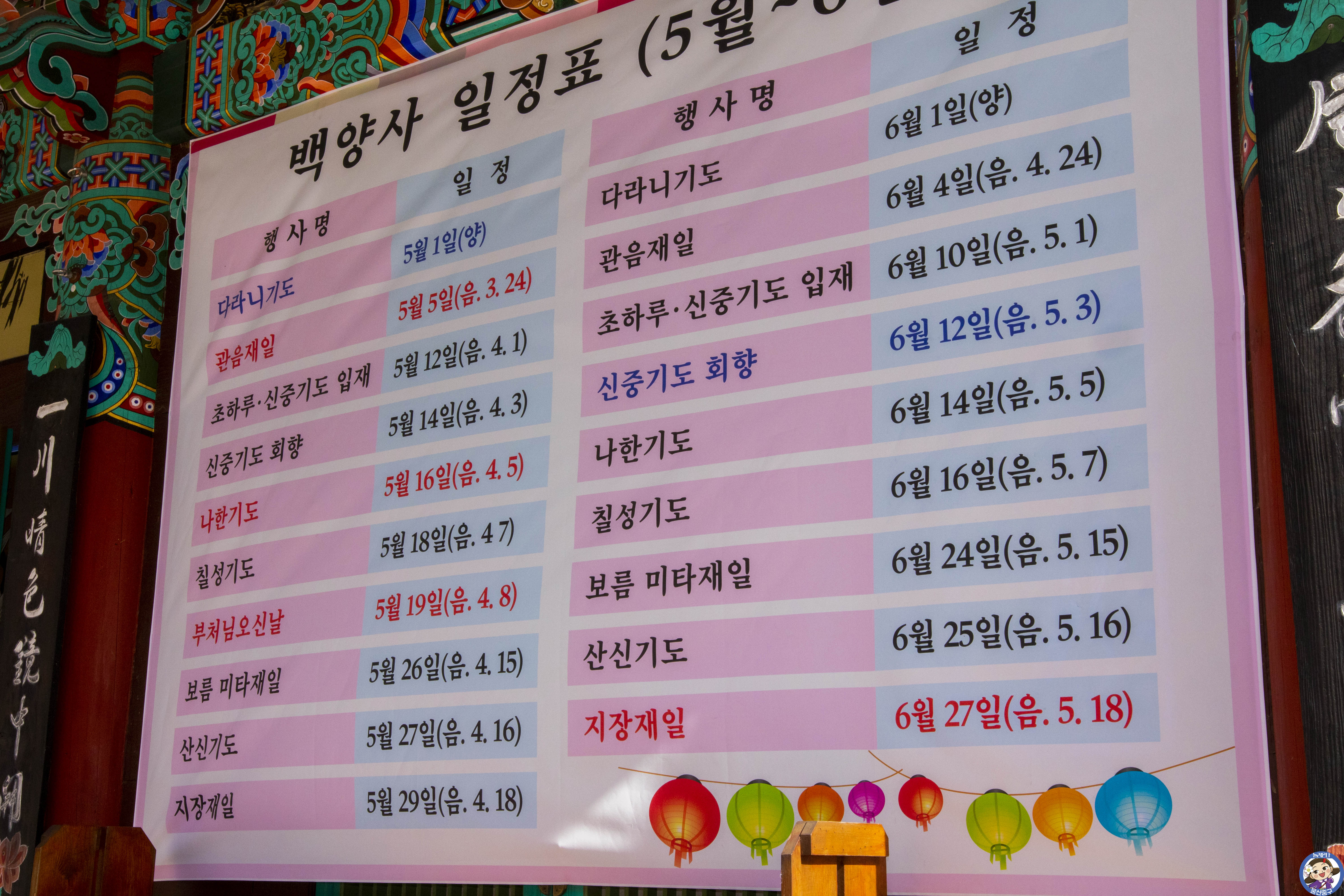 백양사는 매달 백양사 일정표가 사찰 내에 걸려져 있는데 이번 5월은 부처님오신날이라는 큰 행사가 있는 만큼 많은 구민분들이 5월 19일에 방문할것으로 예상이 됩니다.