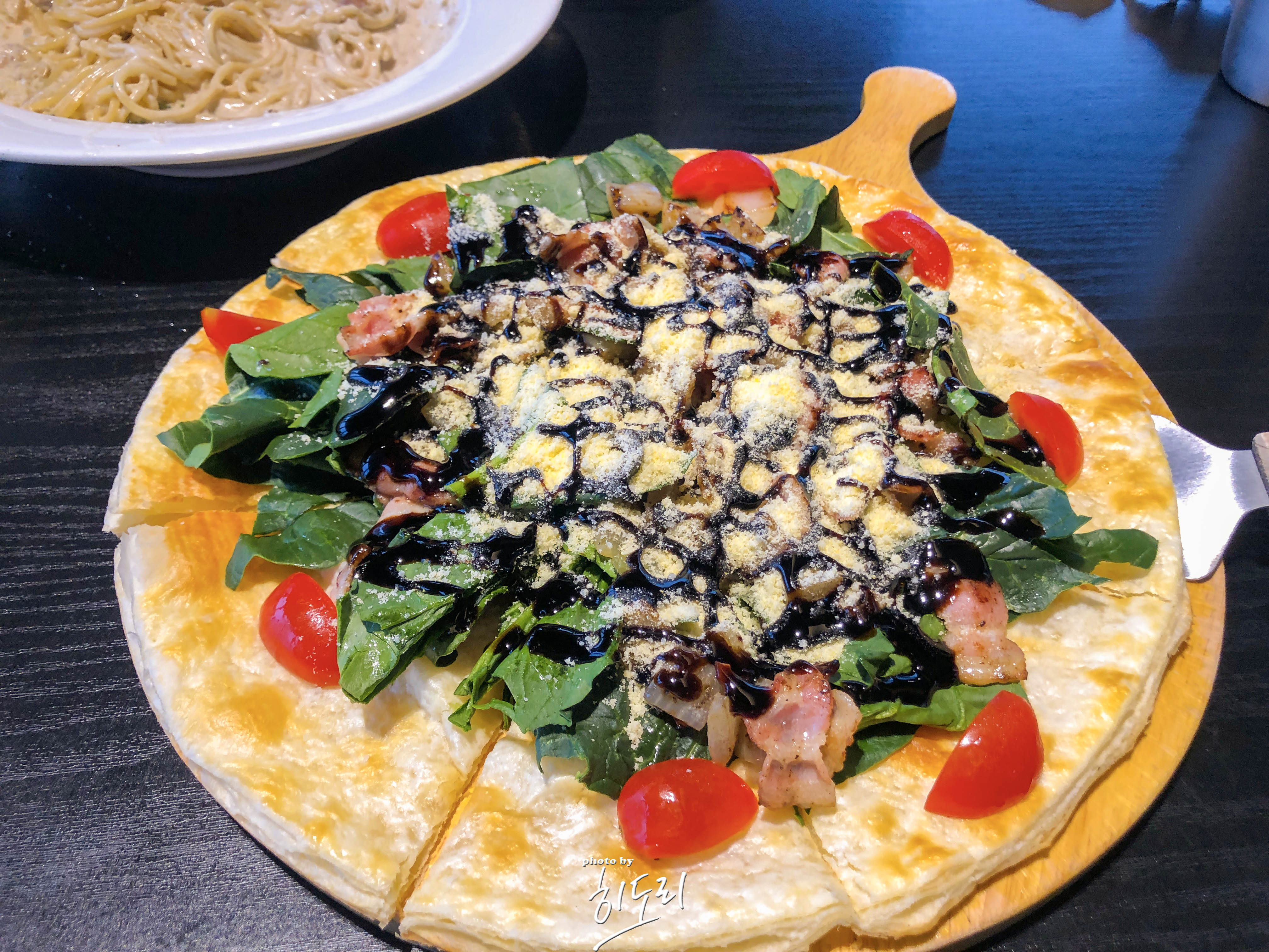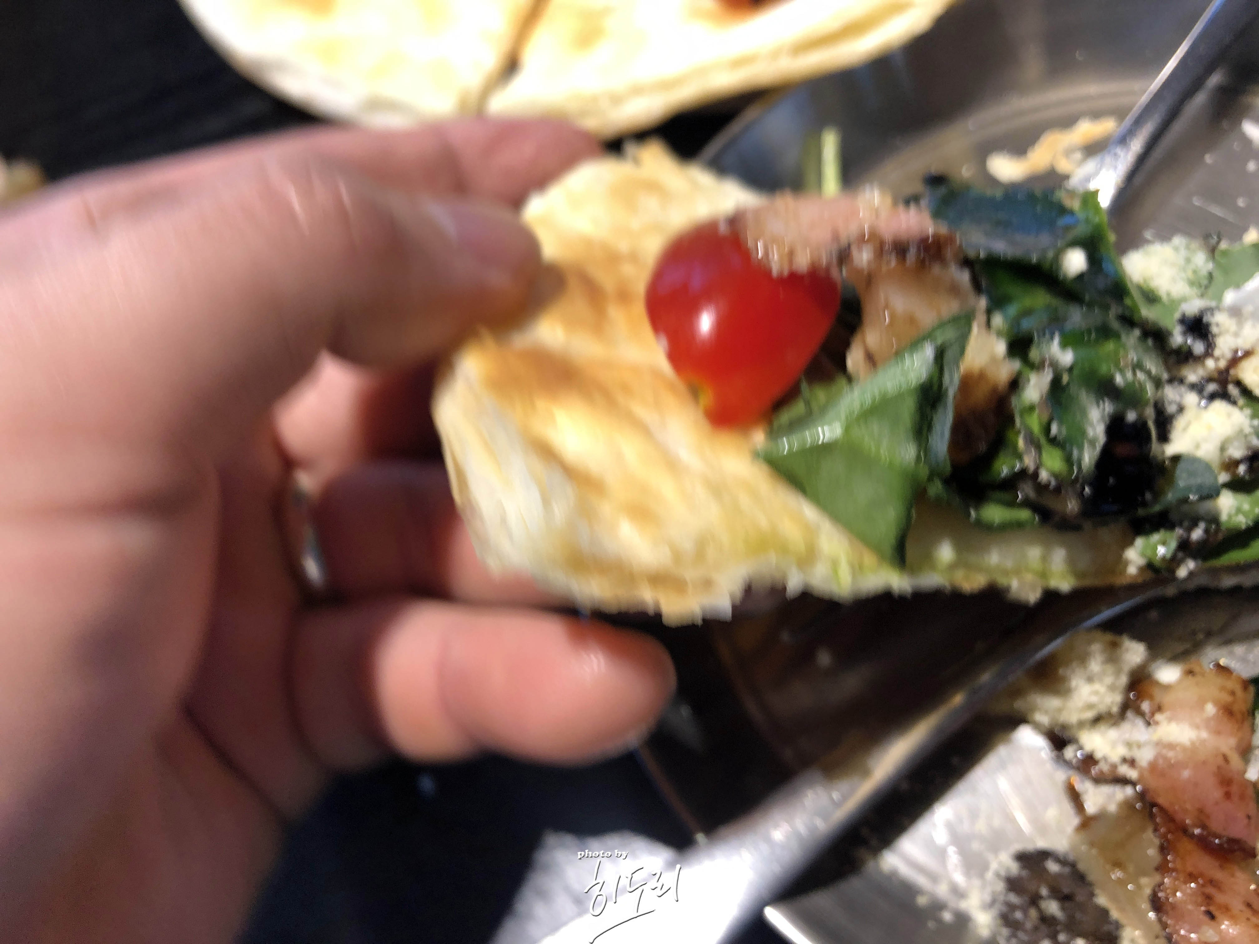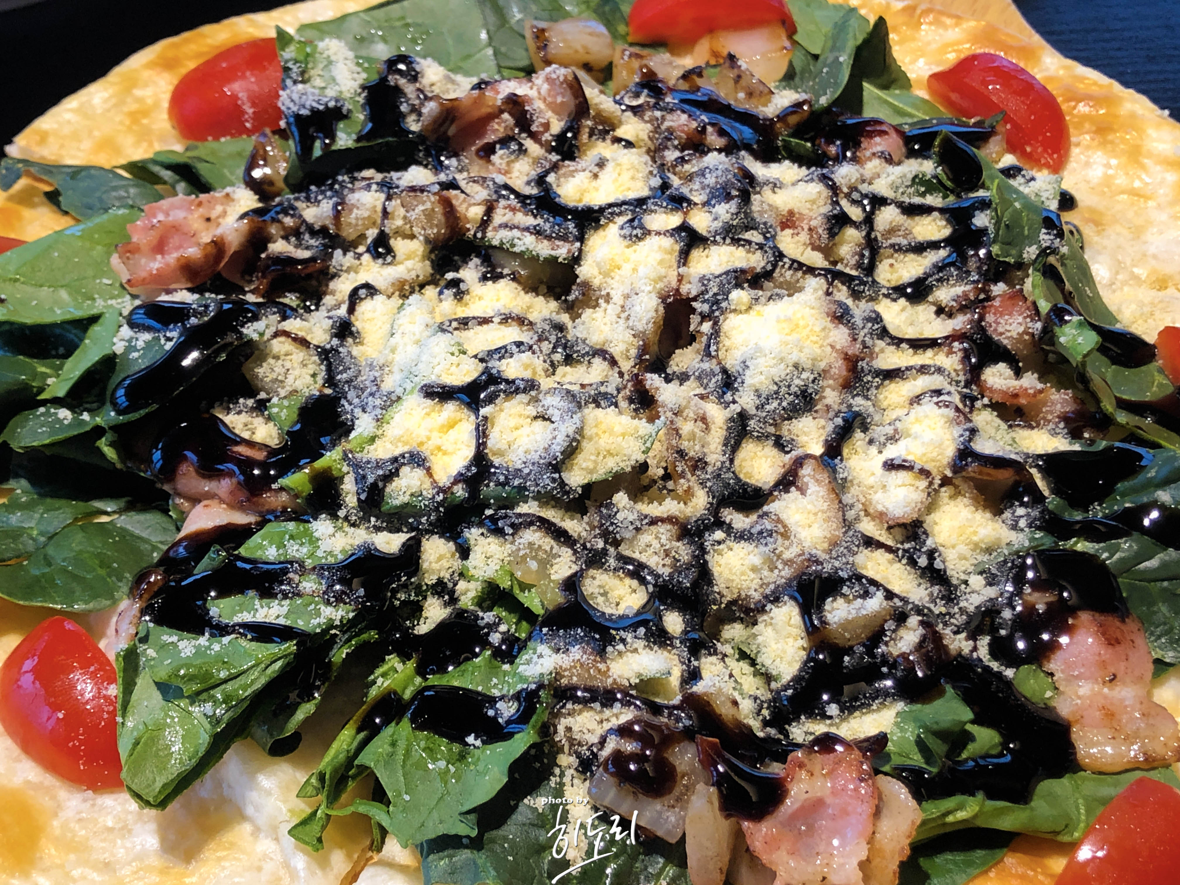 무엇보다도 피자 도우가 일반 도우가 아니라 파이같은 페스츄리 도우로 입에서 녹으며 시금치와 베이컨 그리고 파마산 치즈가루의 조합은... 역대급 피자입니다.